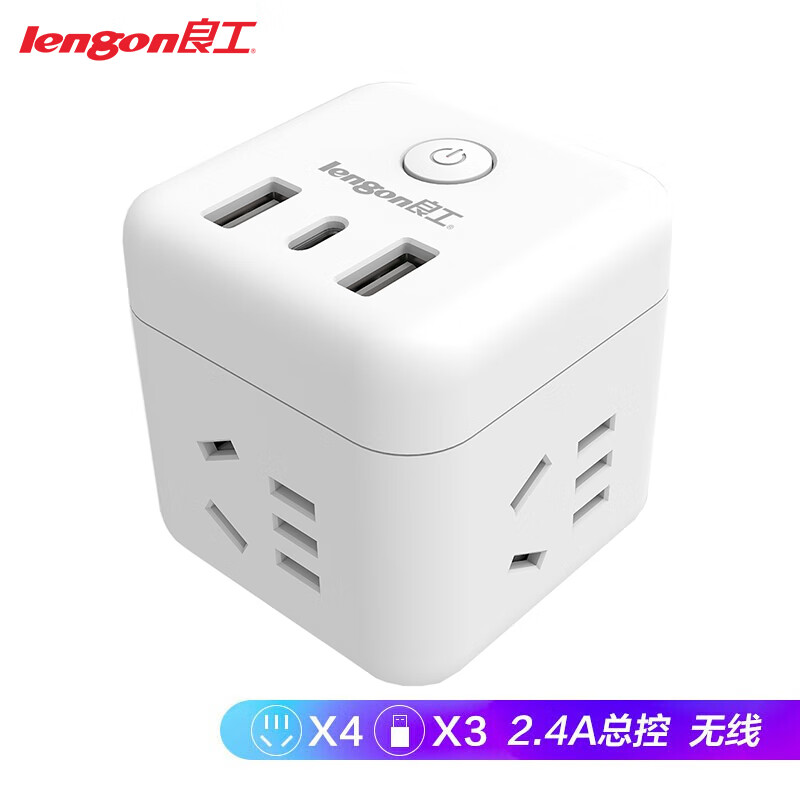 良工(lengon)Type-c/USB转换器插座智能插座多功能无线国标魔方插线板插头一转四Q604U白色