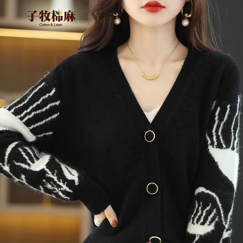 子牧棉麻2022秋装新款 女韩版百搭慵懒风V领针织开衫简约休闲印花外套0666 黑色 L(建议105-120斤)