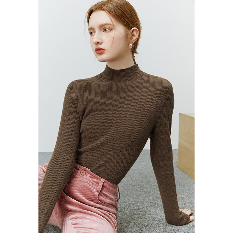 范思蓝恩22FS4574弹力坑条紧身毛针织衫冬装羊毛半高领多色打底衫 燕麦色 M