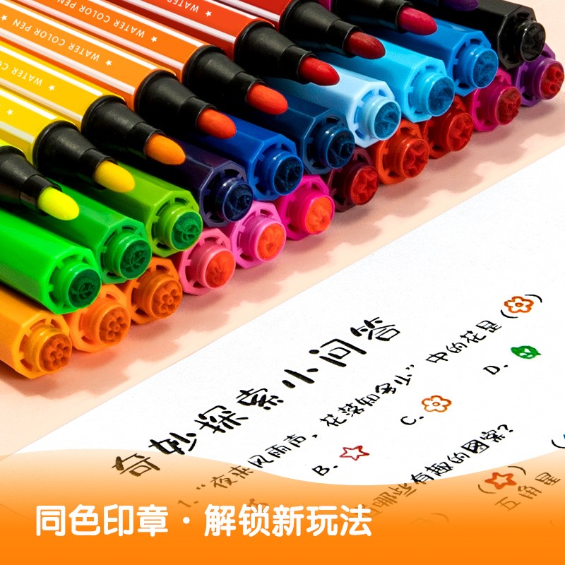 此款可水洗印章水彩笔的笔芯色彩鲜艳绚丽,色系饱满丰富,出水流畅浓郁。笔帽同色印章设计,盖印清晰,多种卡通图案印章解锁新玩法,和宝贝一起趣味互动探索答案,也可作为装饰点缀。笔头为高密度纤维材质,不易起毛翻毛,笔尖出墨顺滑流畅,让宝贝可以尽情绘画,不易漏墨也不易缩进。选用科学易水洗配方,水溶解性好,多种材质上色易水洗,让宝贝尽情涂鸦作画。 阅读全文