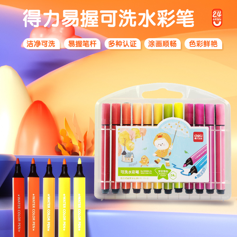 得力(deli)24色可水洗水彩笔易握粗三角学生儿童涂色颜色马克笔画笔套装文具美术用品六一礼物33986-24