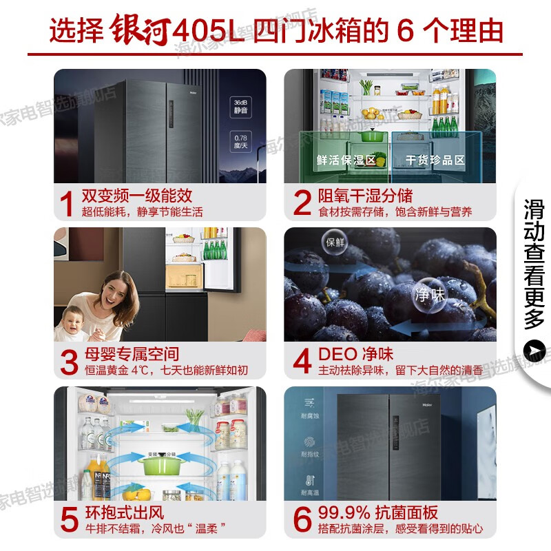 海尔(Haier)冰箱 405升四开门十字对开门多门双变频一级能效风冷无霜超薄家用智能电冰箱旗舰店 405L银河灰+1级能效+阻氧干湿分储+手机智控