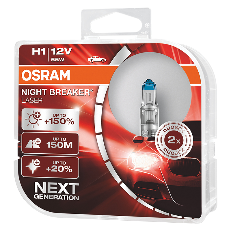 欧司朗(OSRAM)新一代激光夜行者 H1 汽车灯泡大灯近光灯远光灯卤素灯 增亮150% 2支装 12V 55W