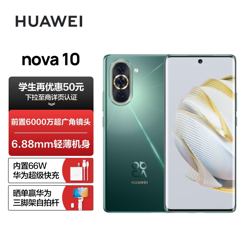 HUAWEI nova 10 【内置66W华为超级快充】 前置6000万超广角镜头 6.88mm轻薄机身 128GB 绮境森林 华为手机