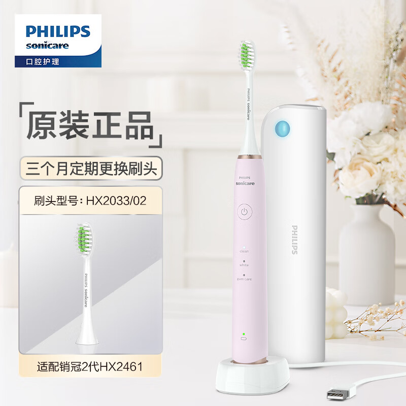 飞利浦电动牙刷成人情侣款礼物送男友/女友 3种模式 带紫外线杀菌牙刷盒+软毛刷头 蔷薇粉HX2461/04