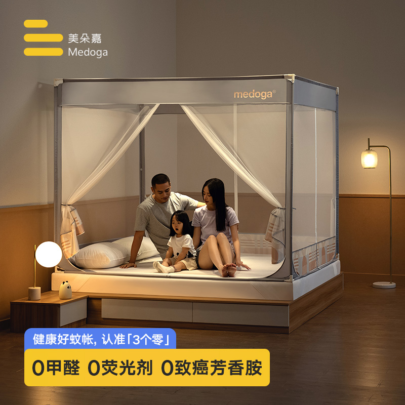 美朵嘉MEDOGA 抗菌蚊帐家用坐床蚊帐卧室儿童防摔蚊帐婴儿加密加厚支架加粗三开门 月金灰1.8m床