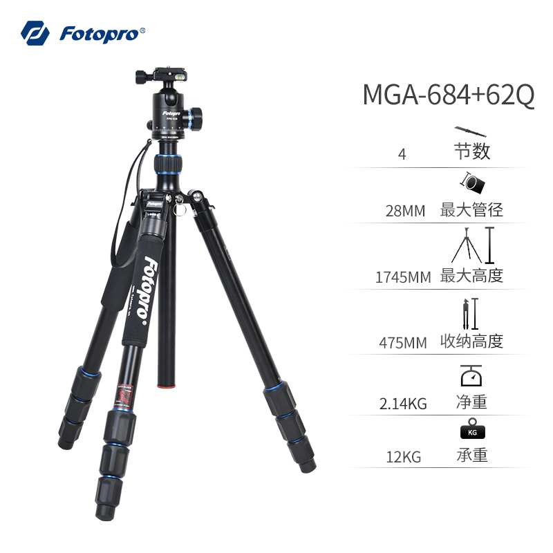 富图宝 Fotopro MGA684+62Q 含云台单反相机三角架 28管相机支架 相机云台独脚架 相机摄影三脚架云台