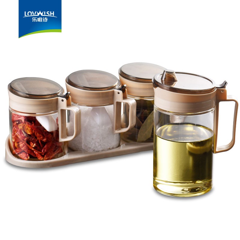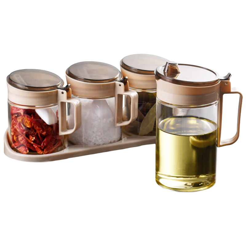 乐唯诗 玻璃油壶防漏油瓶调料罐调料盒小油罐家用酱油瓶香油醋瓶调味料罐液 【卡其色】油壶1+调味罐3+底托