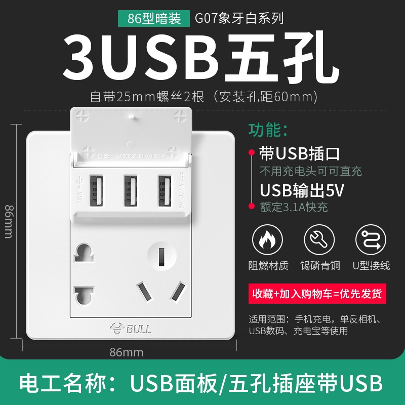 公牛插座面板三位usb86型10a多功能二三插电源暗装USB智能充电插座面板