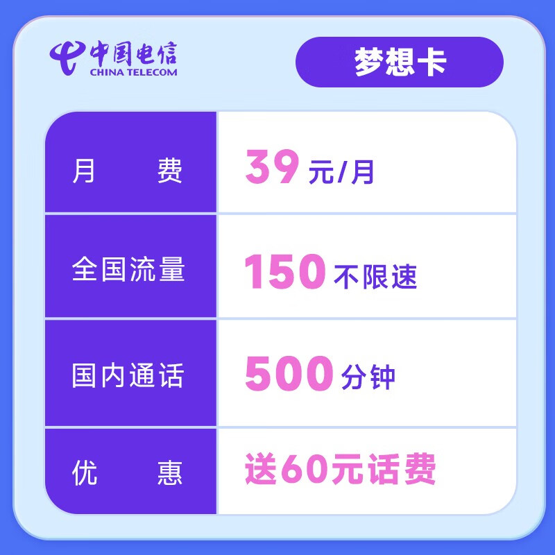 中国电信 手机卡纯上网卡不限速5G流量卡月租全国通用大流量号码卡电话卡校园卡 梦想卡39元150G-MXK
