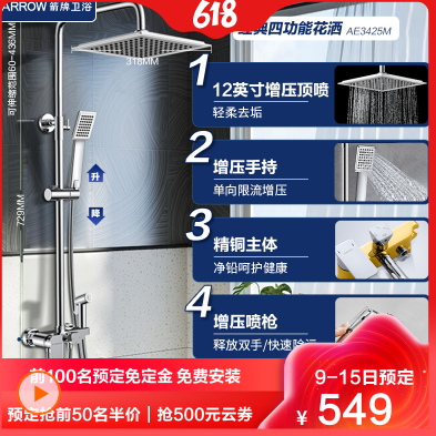 箭牌卫浴(ARROW)增压淋浴套装 全铜淋雨龙头花洒喷头 多功能增压AE3498CP 【618特价】方形简约多功能喷枪花洒AE3425MS 15日前1小时付尾款再返50元
