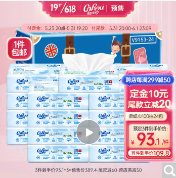 可心柔V9婴儿纸巾新生儿保湿纸巾云柔巾乳霜纸抽纸柔纸巾100抽24包 【季节上新】端午节粽子上新啦,嘉兴粽、广式粽、徽粽,低至9.9元,欢迎抢购