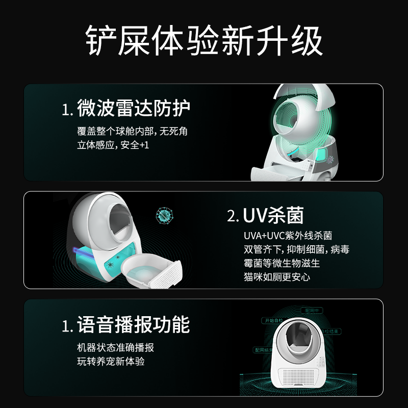 全自动智能猫砂盆一代,超大空间,主要特色是:自动铲屎+无臭无尘+低分贝+球体水洗,并且设有防猫卡脚机制。全程172秒高效铲屎、清除异味,解决铲屎官出差加班清洁猫咪排泄物的问题,但注意3个月以上的猫咪,猫砂盆才能智能识别哦。 阅读全文