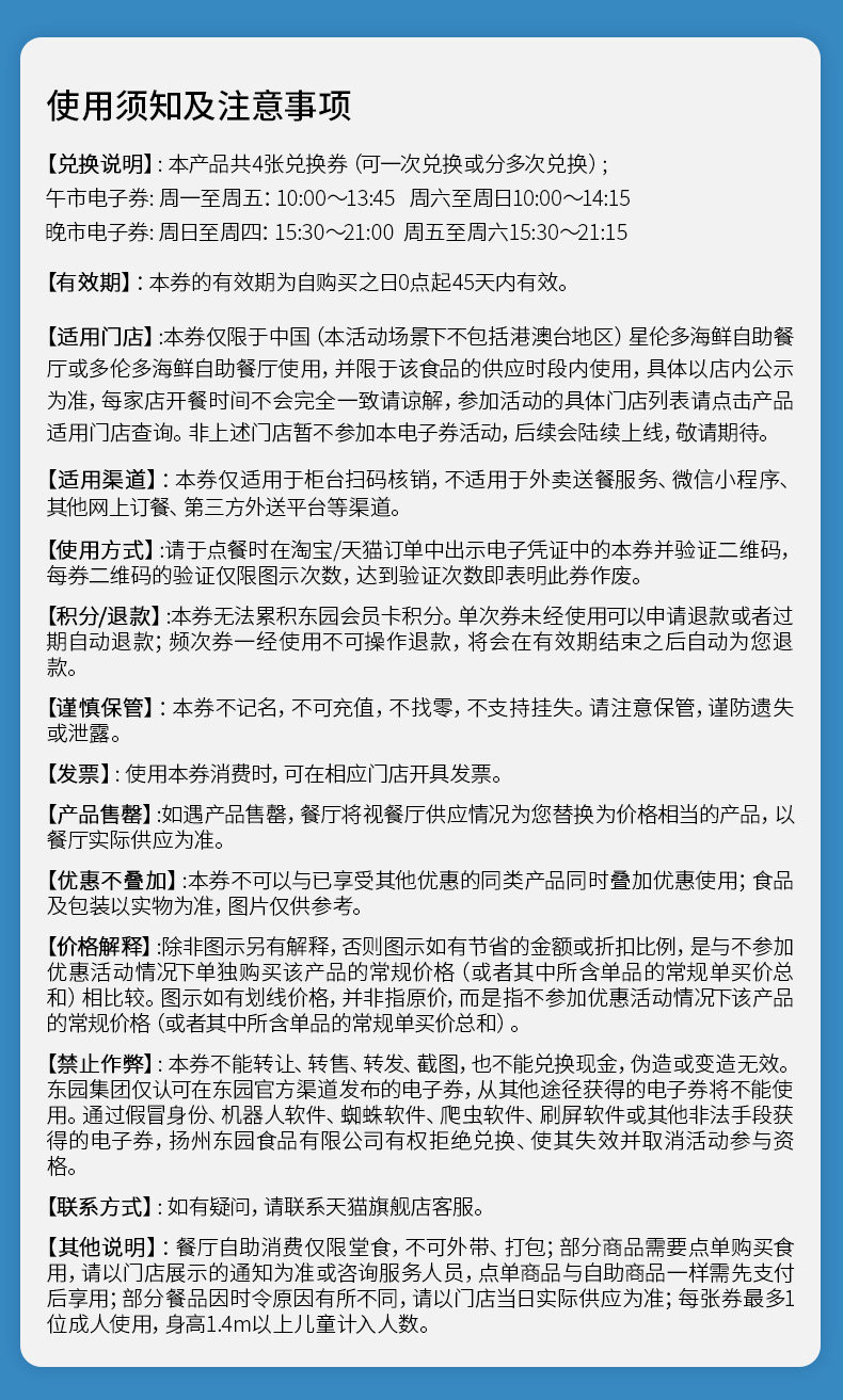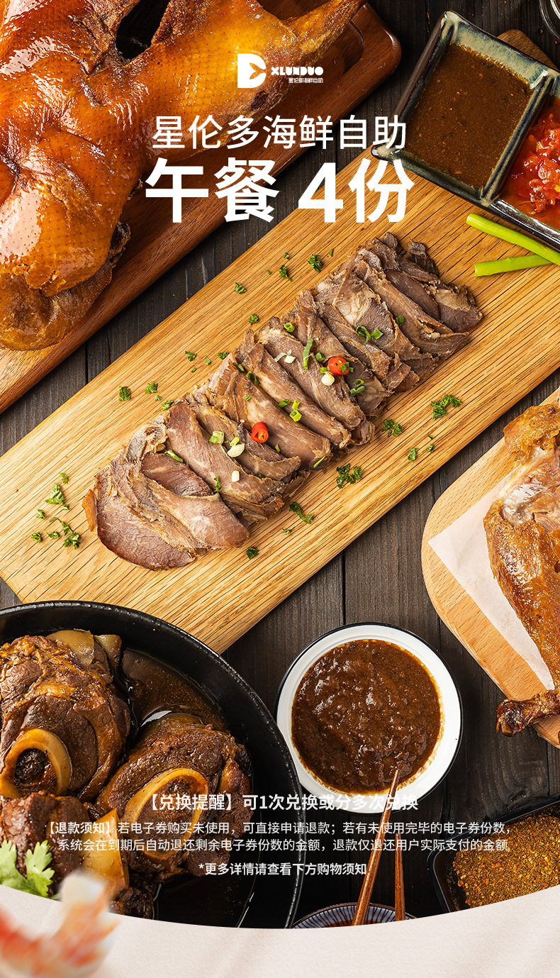 4份午餐电子券 星伦多海鲜自助午餐 可分次兑换