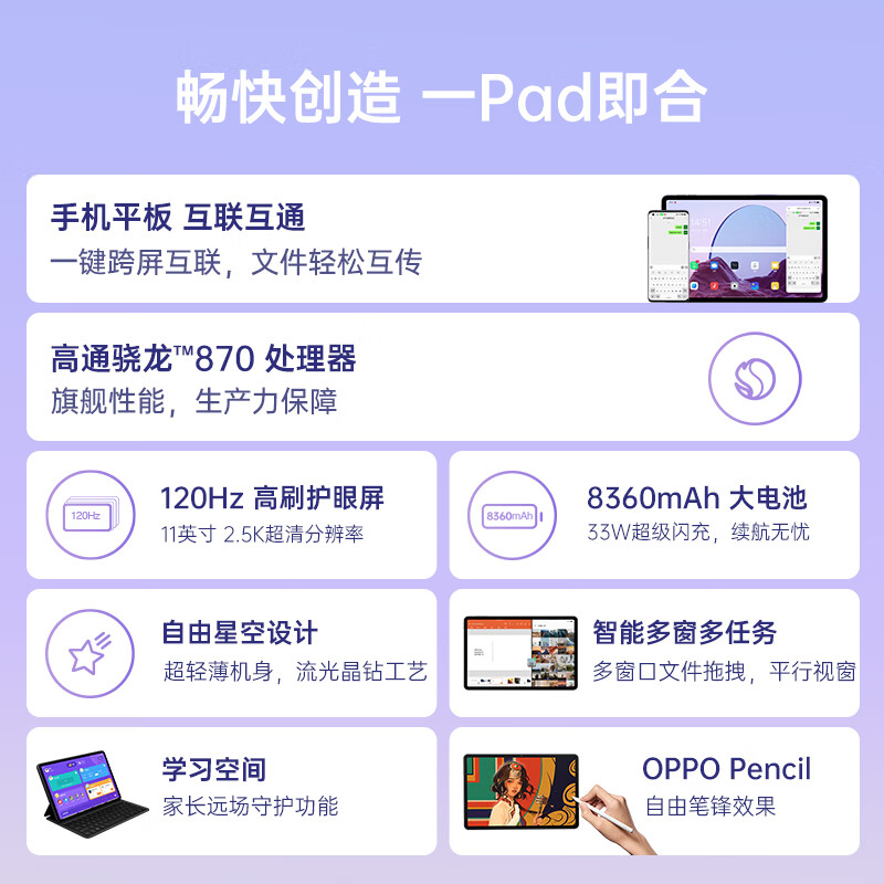 OPPO Pad平板 11英寸 2.5K 120Hz高刷护眼屏 8360mAh 骁龙870 8+128GB 影音娱乐办公学生网课平板电脑 极光紫京东 推荐人: 丁丁小编 发布时间:2022-11-10 22:37:47
