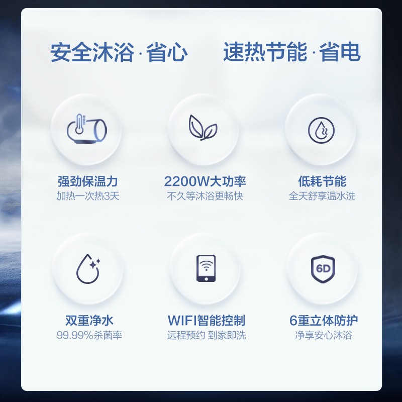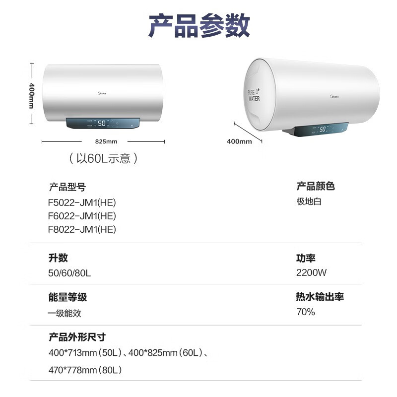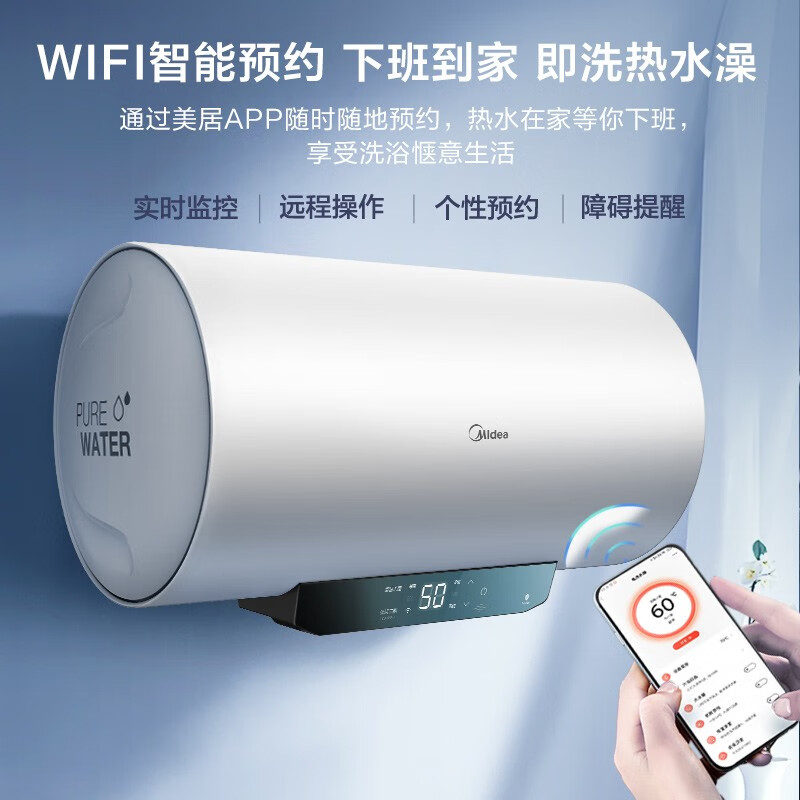 美的 JM1系列 储水式电热水器,拥有2200w大功率,热水输出率高达70%,符合一级能效标准,全天保温也用不上1度电。强效保温72小时,一次加热能用三天。一键开启45℃智能省电模式,告别反复加热,省电舒适。双重净水技术,杀菌率高达99.99%,使沐浴更加健康。支持WiFi连接美居APP,可以实现远程控制、定时预约、故障提醒等功能。