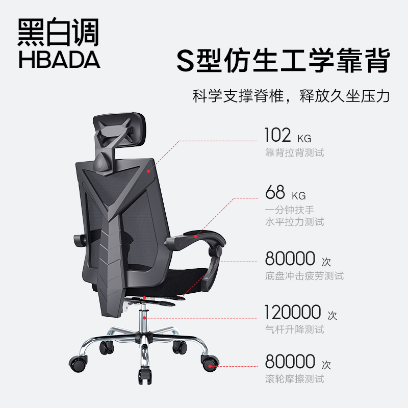 此款产品为黑色无脚托款,背部采用Y字型的设计,融入龙脊的元素。多功能调节的头枕,可7级升降,30°旋转,符合人体颈部的曲线,使用时分担颈部的压力。椅子的框架采用原生工程PP材料,安全健康环保。内嵌式高密度的网布设计,强劲回弹力,给背部舒适的支撑。坐垫采用原生加厚海绵,厚度有9cm,外部亲肤包裹的绒布设计,坐感舒适。155°的后仰功能,角度可任意调节,8cm上下升降功能,满足不同人群的需要。SGS三级认证气压杆,有效提高安全系数。