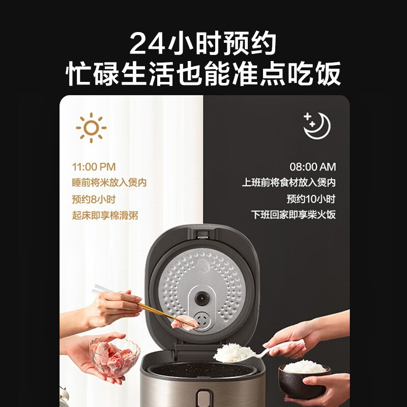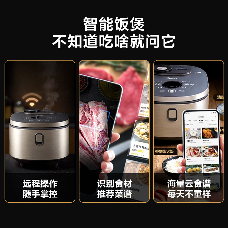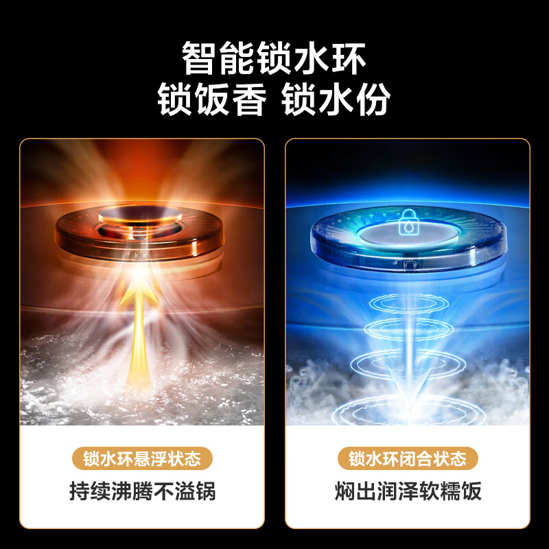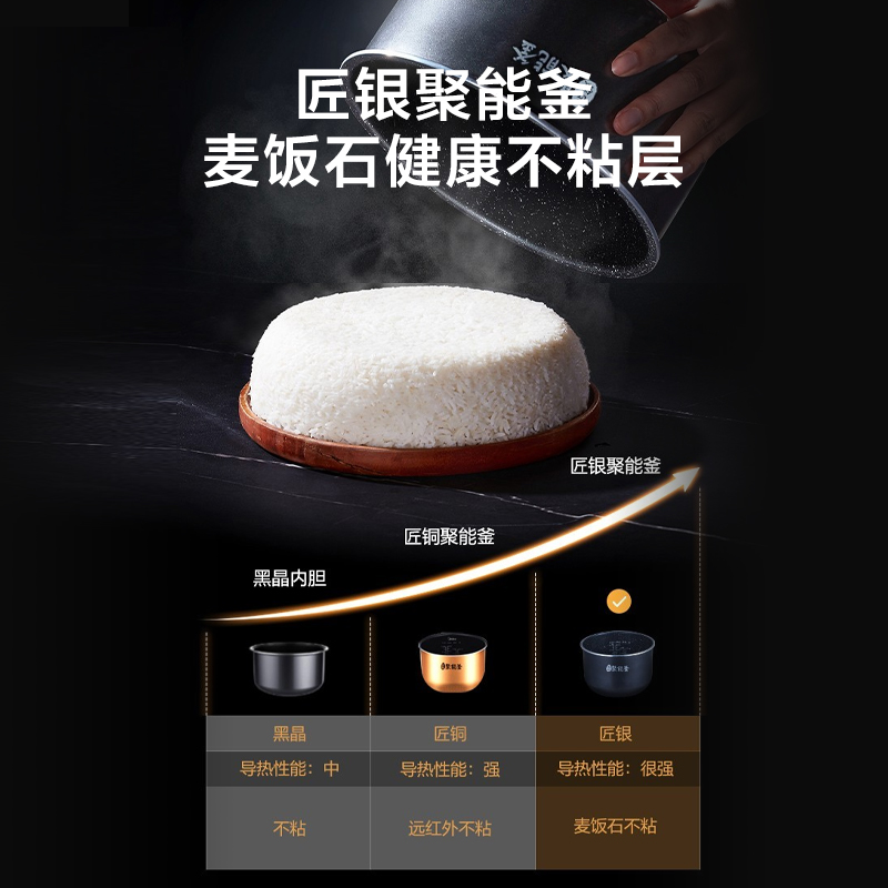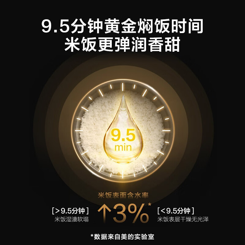 锁水锁香,米饭嘟嘟水亮,9.5分钟黄金时间焖饭,开盖即吃水亮饭。大火持续沸腾20分钟,不溢锅,受热均匀,米饭粒粒分明。强力锁水,焖出润泽软糯,形成100帕微压力,激发米芯香气物质。760M猛火力,大功率导热快 ,米饭透芯不夹生。