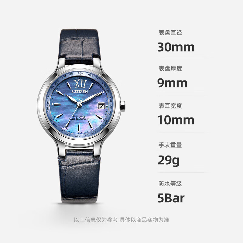 西铁城推出的这款女士腕表,选用星空贝母圆盘,条钉刻度搭配银色指针,加以独立日期窗口显示,方便你查看时间。皮质表带搭配打孔扣,职场气息十足,佩戴舒适且方便脱戴。具有光动能,不用担心耗电问题。蓝宝石水晶玻璃表镜设计,防刮耐磨。具有生活防水功能,满足您的日常佩戴需求。