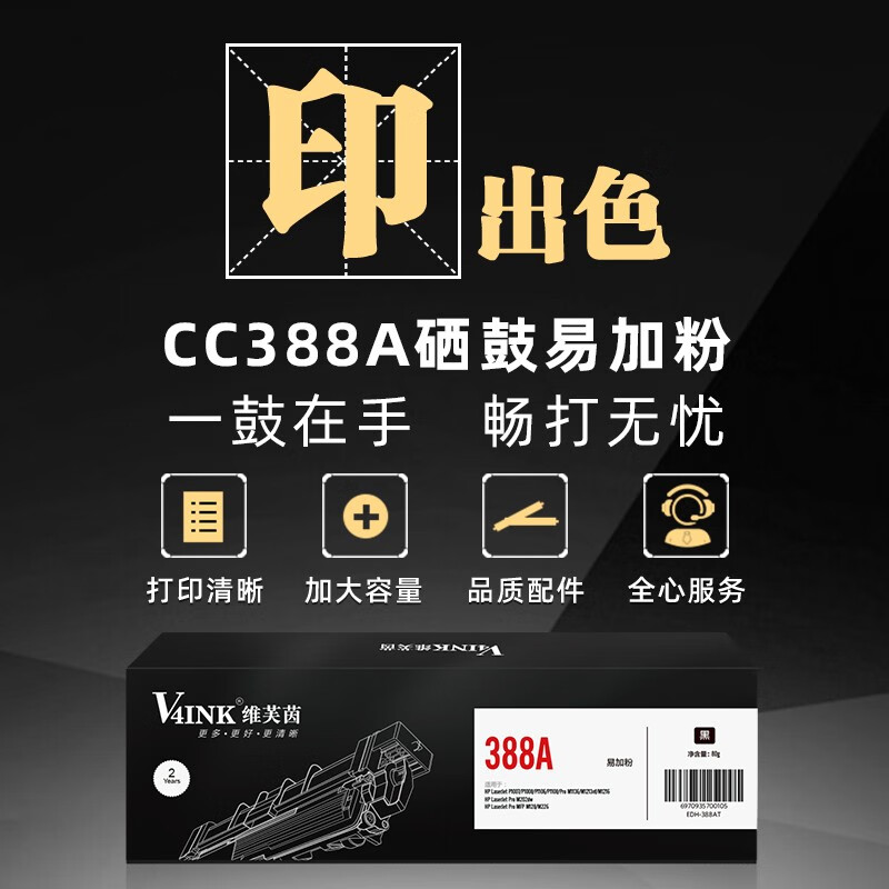 V4INK 维芙茵 CC-388A 易加粉硒鼓,单支碳粉含量80g,约可打印1500页,采用品质碳粉颗粒,黑度高。这款碳粉盒为单支装,适用于P1007;P1008;P1106;P1108;M126a;M126nw等机型。