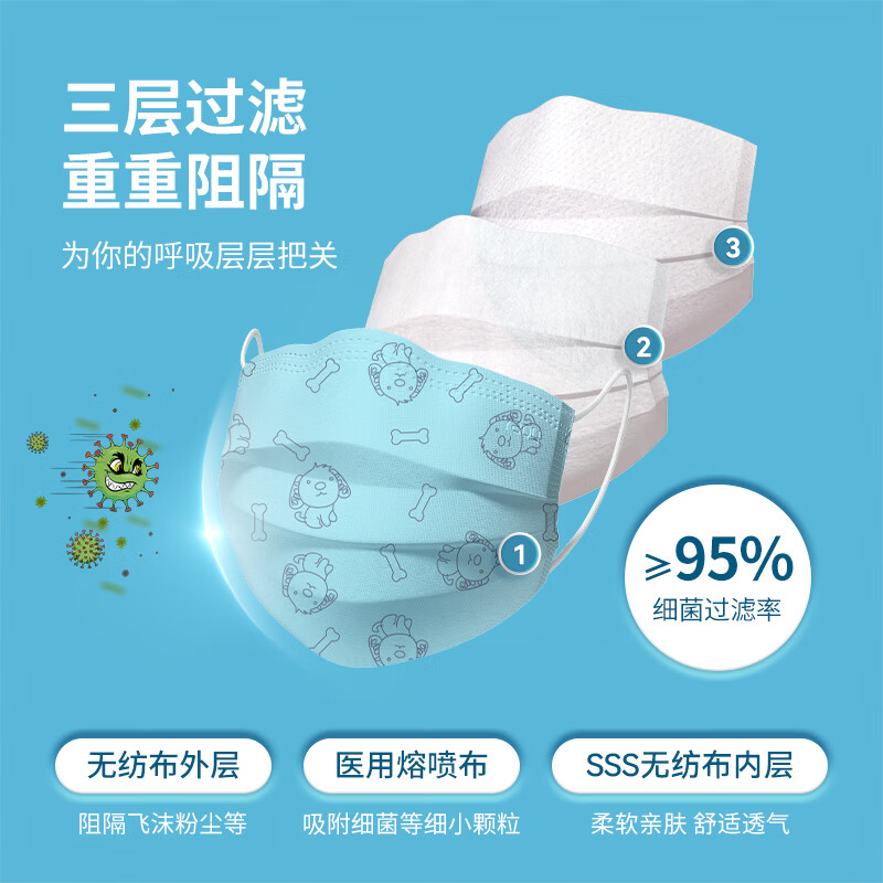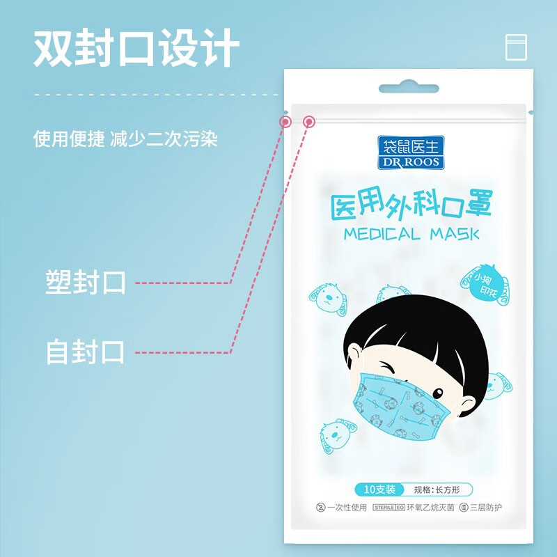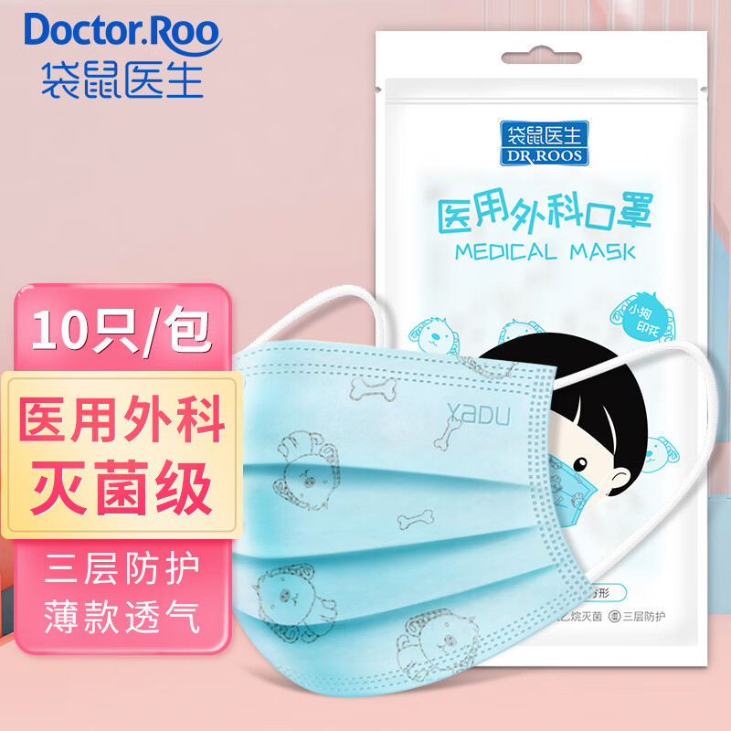 DR.ROOS 袋鼠医生 一次性医用外科口罩 儿童款,让孩子健康防护,安心入学,防飞沫接触,防雾霾粉尘,防病菌传染,防汽车尾气,具有三层防护,内层无纺布,吸附体内呼出热气,亲肤舒爽,中层bfe≥95%熔喷布,吸附病菌,过滤异昧,外层无纺布,静电吸附,防尘防霾,采用环氧乙烷灭菌,医用标准,甄选静电熔喷布,持续隔离微生物病菌,0荧光不含甲醛,面料防尘性优良、无荧光剂,不伤害儿童娇嫩皮肤。牢固防脱,点焊技术,经的起宝宝随意拉扯,不易脱落,佩戴舒服,宽扁设计高弹耳挂,减轻宝宝对口罩的抵触情绪。隐藏式可调鼻夹,贴合面部,可塑性强,弧度可随意调整。