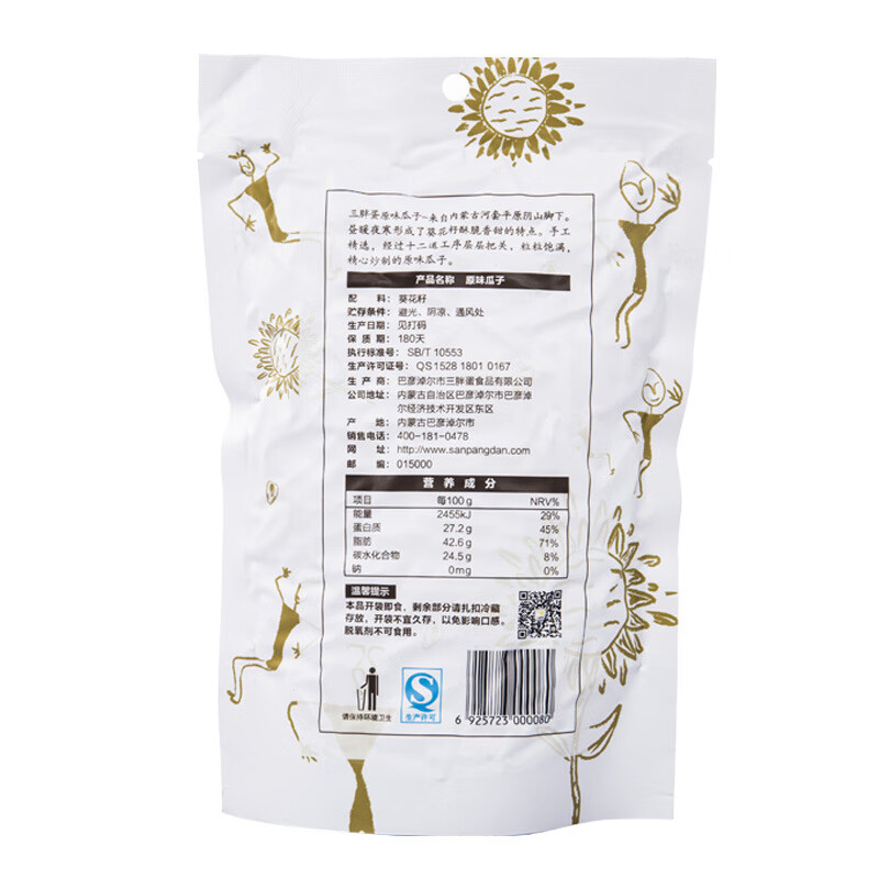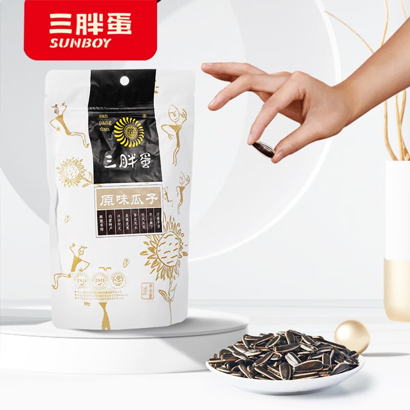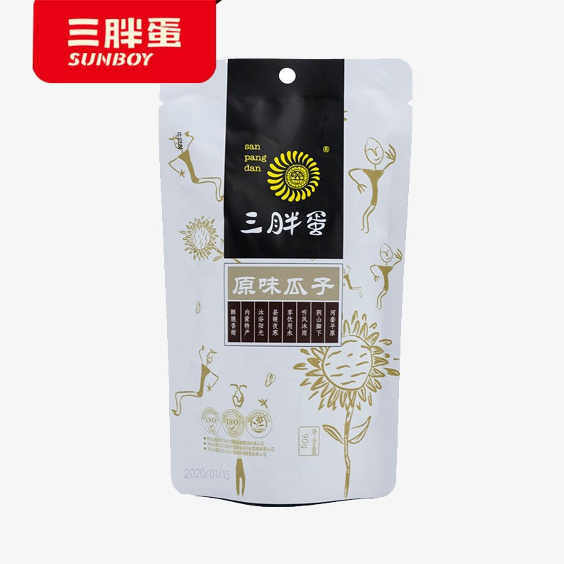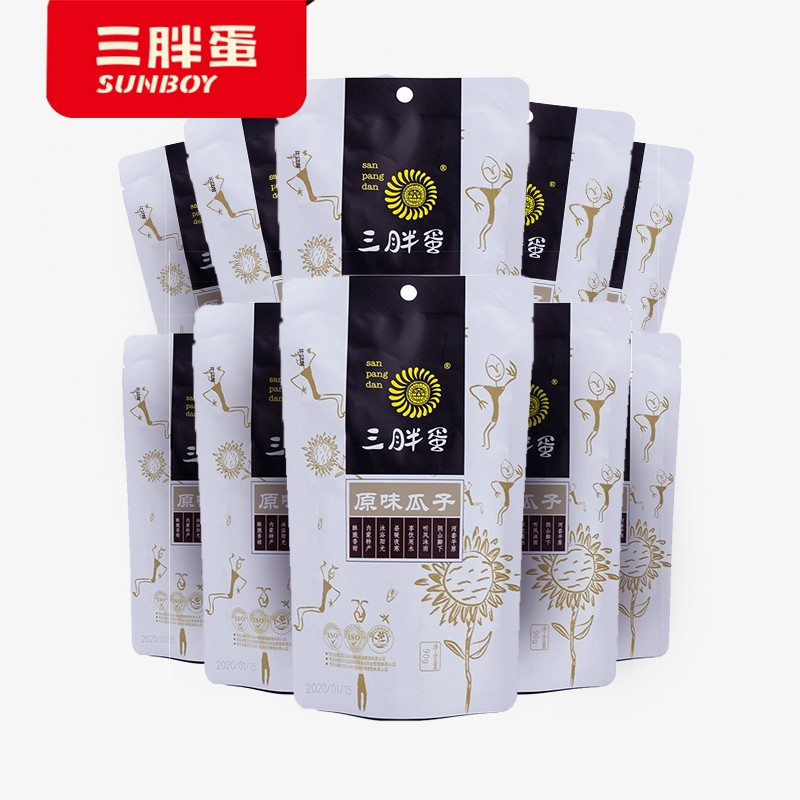 三胖蛋原味瓜子,配料选用内蒙古葵花籽,经多道人工挑选,颗粒饱满,低坏籽率、表皮干净 不脏手;瓜子粒大仁香,香酥可口。真空包装,阻氧防潮。保质期6个月,建议置于阴凉干 燥处储存。 规格:90克*10袋