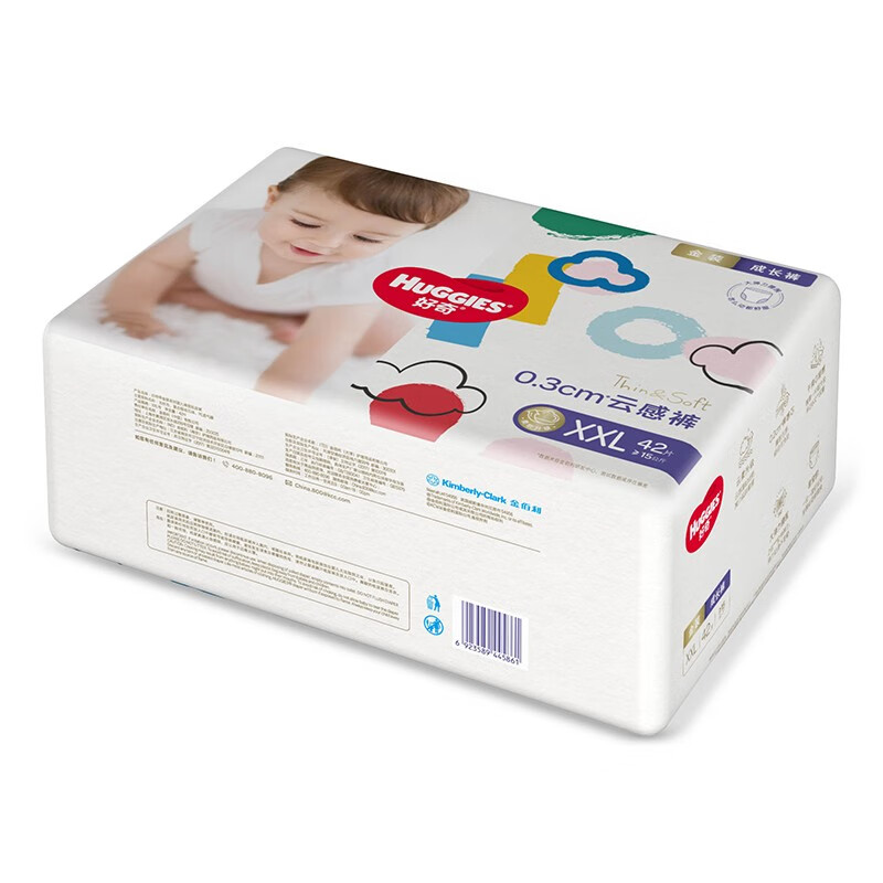 Kimberly金佰利是来自美国的世界级家用纸类、无纺布及吸水体方面的技术创造者。旗下品牌好奇于1978年推出,是全球领先的婴儿纸尿裤品牌,具有透气性强、吸收量大等优点。此款金装成长裤由天然纸浆制作,超强瞬吸三层缩水系统可加速吸收,锁住尿液不回渗。便便防漏兜、加宽后腰围和立体防漏边,防止后漏、侧漏。纸尿裤型号由字母和数字组成,字母代表大小,数字代表纸尿裤片数,此款为XXL号,42片,适合15kg以上的宝宝。