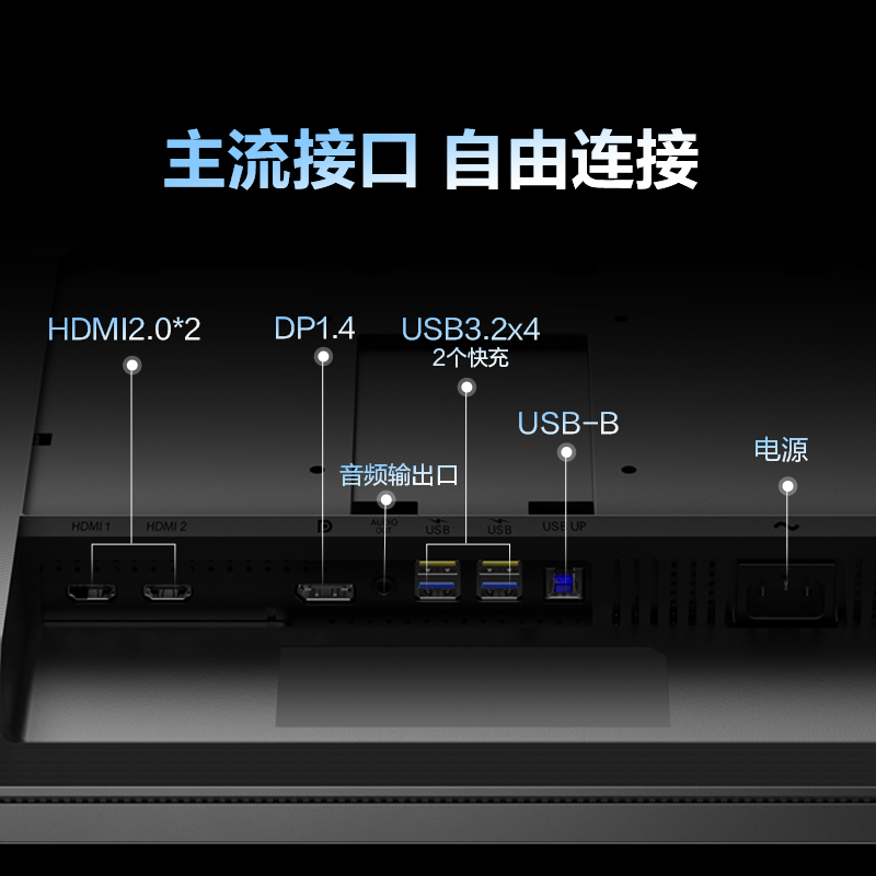 该显示器为27英寸,3边微边设计,刷新率高达144Hz,采用VA面板,1ms响应时间,同时预设多种游戏模式,支持HDR10显示,2560*1440分辨率,96.8%sRGB的色域覆盖率,色彩丰富;具有HDMI*2接口,DP1.4*1,USB3.2*4以及USB-B*1接口。