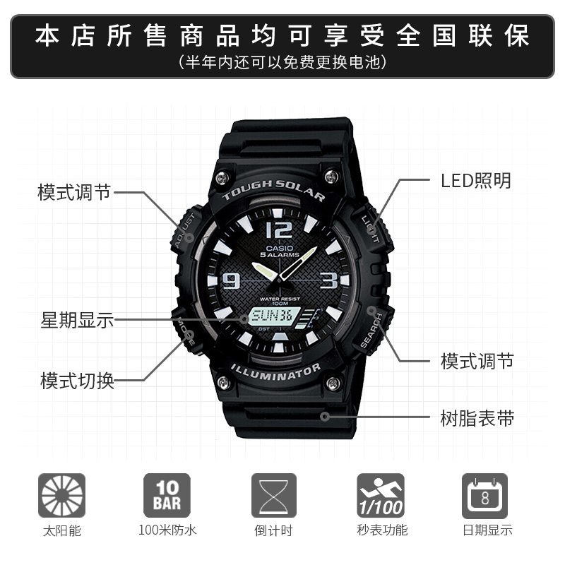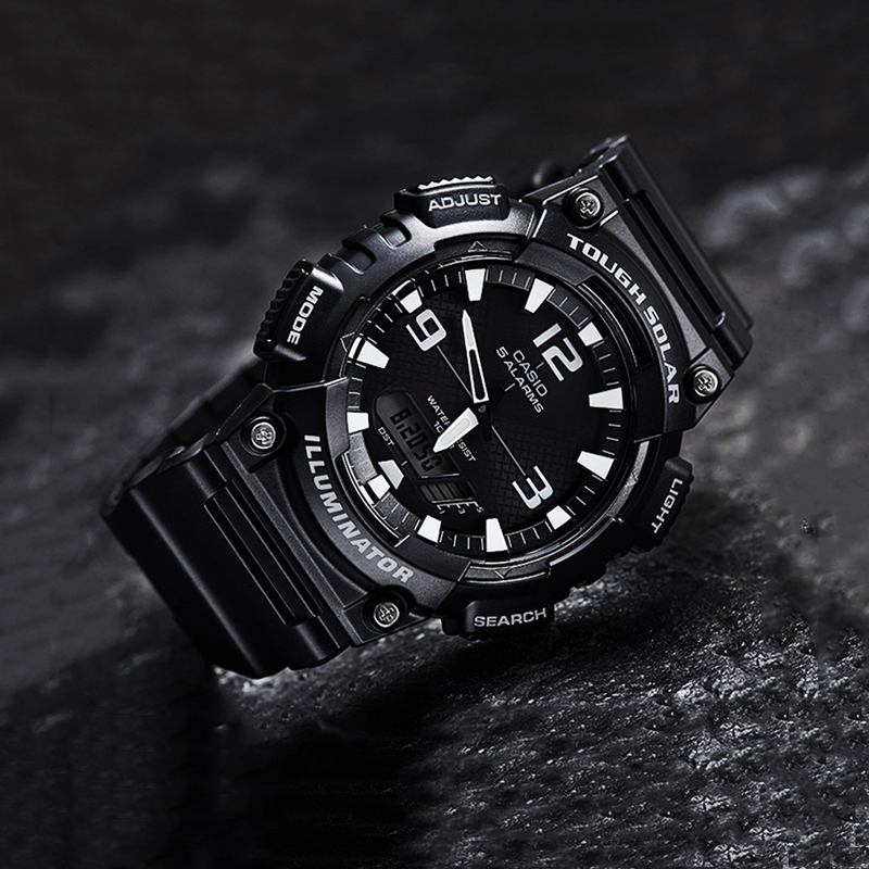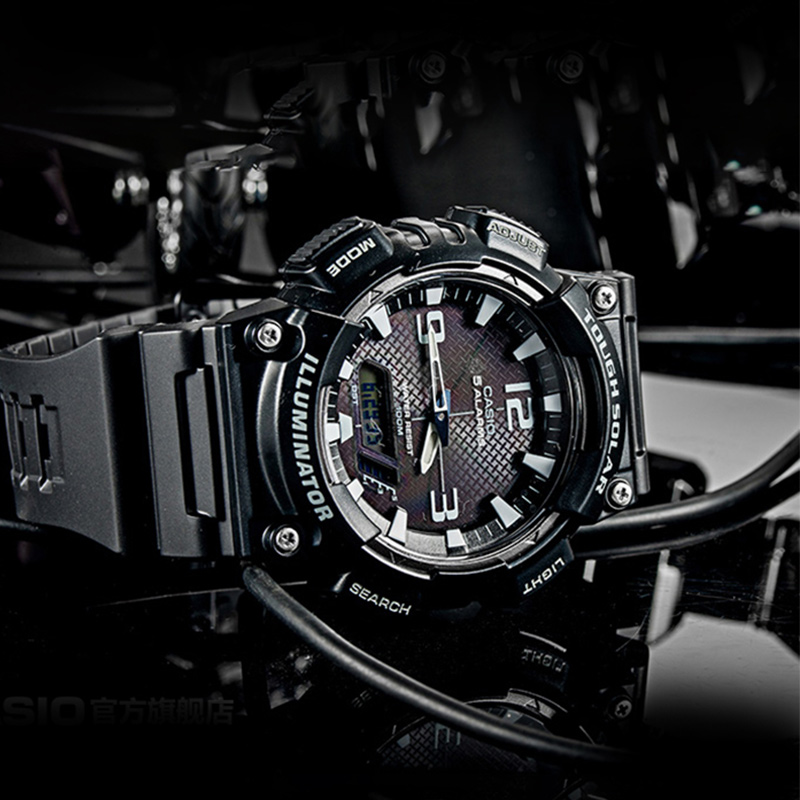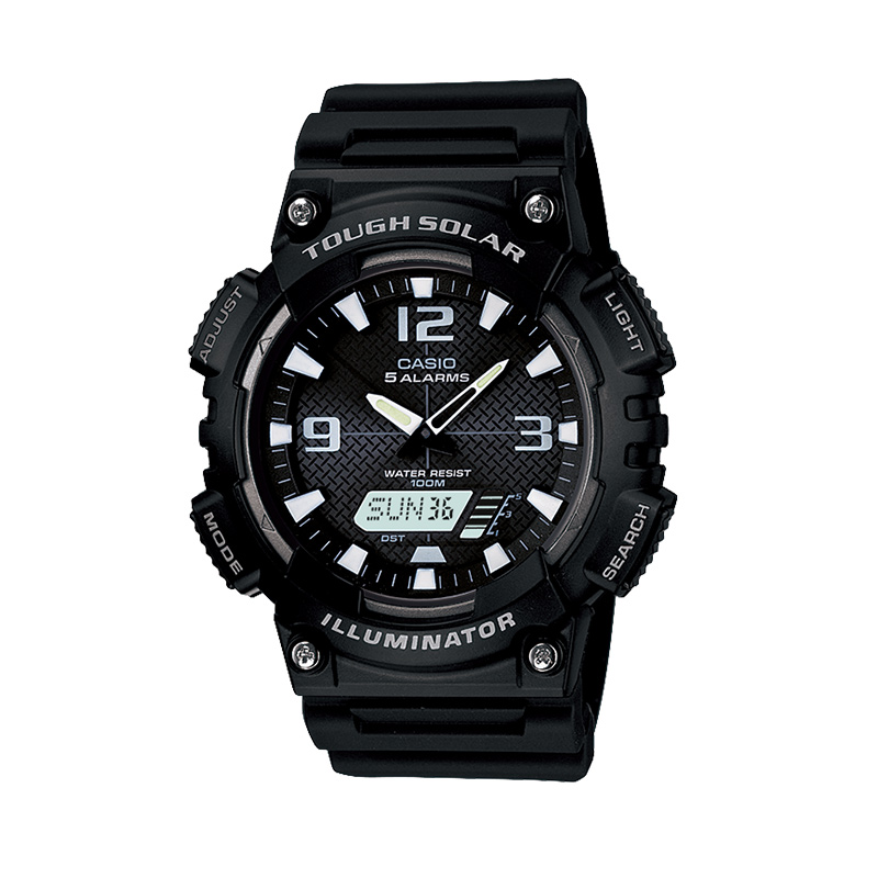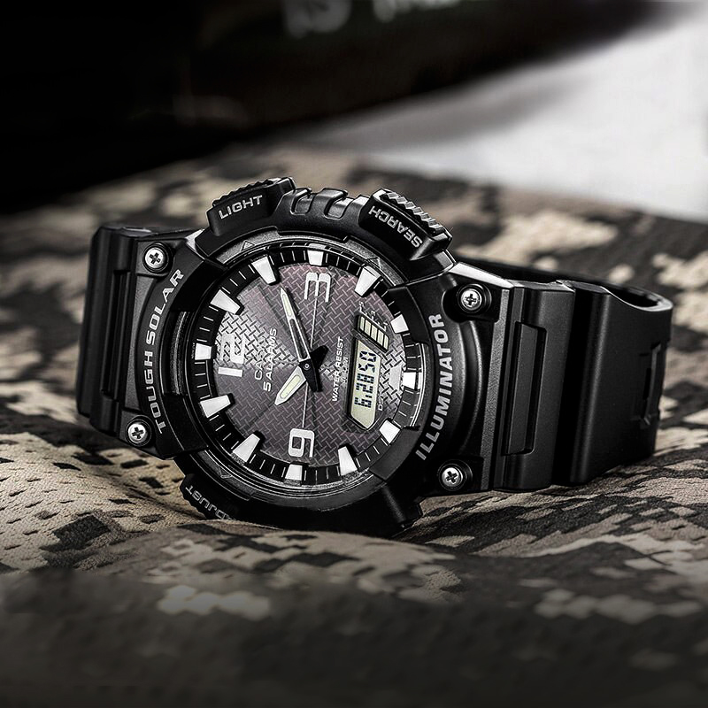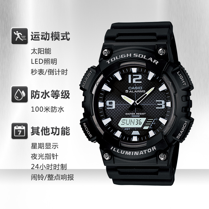 CASIO 卡西欧的这款AQ-S810W运动腕表,外观沉稳大气,支持模拟+数字双显,方便不同情况下查看。太阳能驱动并且带有电量指示,免去了更换电池的烦恼。树脂材质的应用使得穿戴感觉舒适且防止汗液腐蚀;带有背光显示、5个自定义闹钟、自动日历、秒表等等功能一应俱全,表盘直径46mm,具备100米防水,即使游泳等运动场合也是非常堪用。