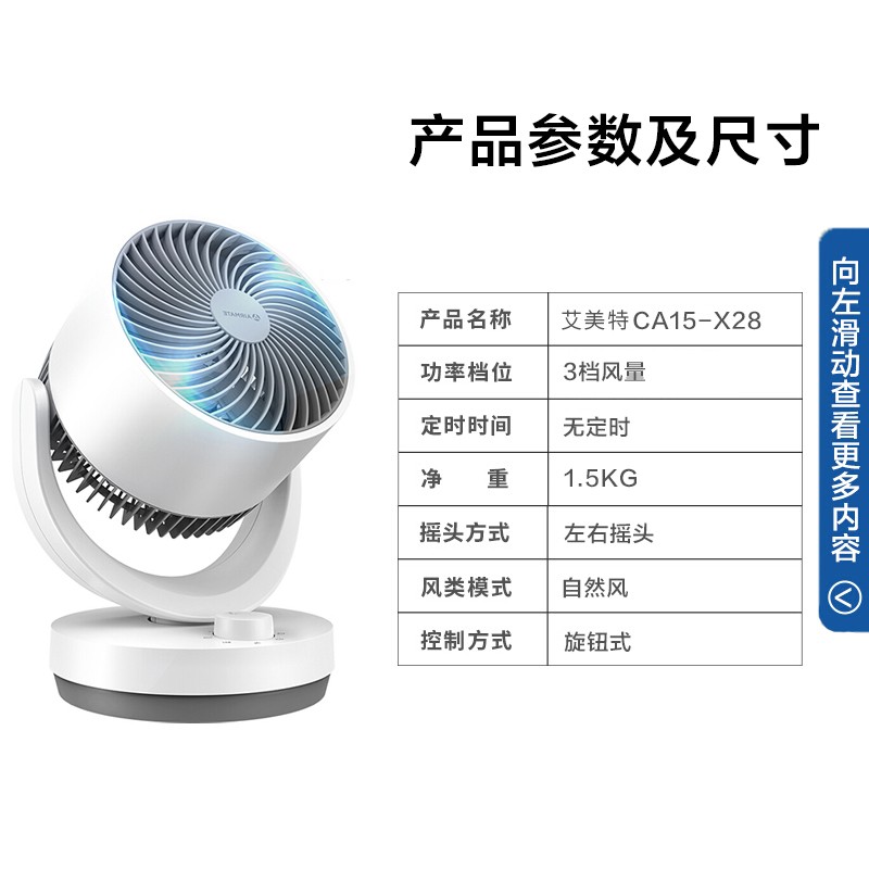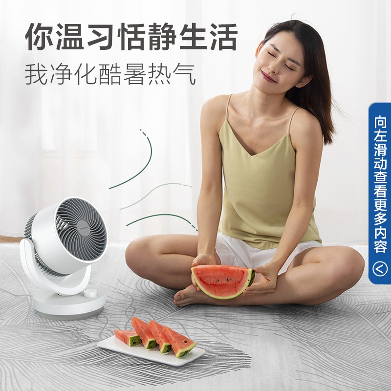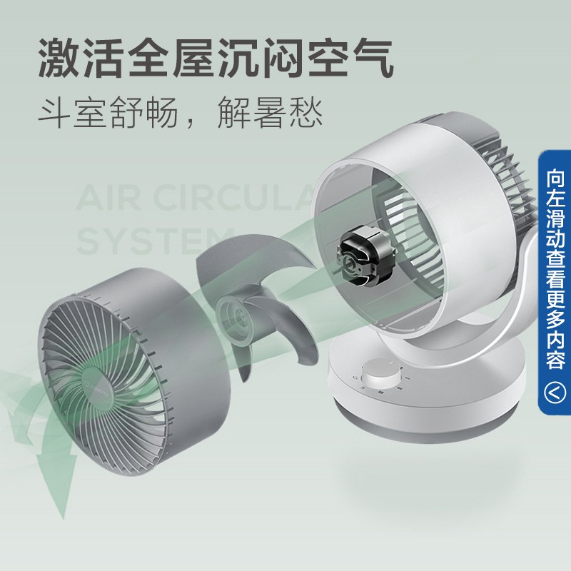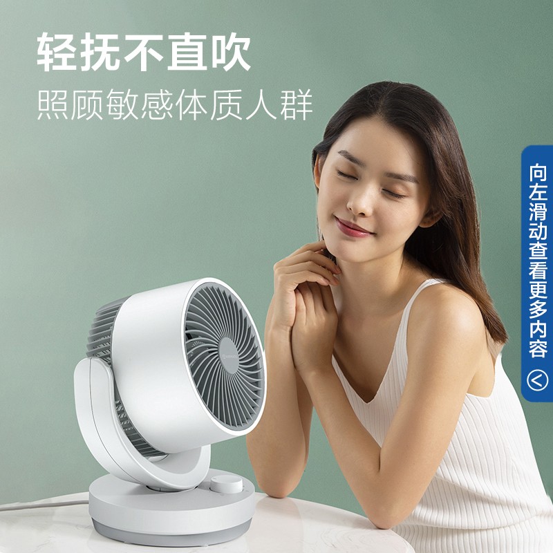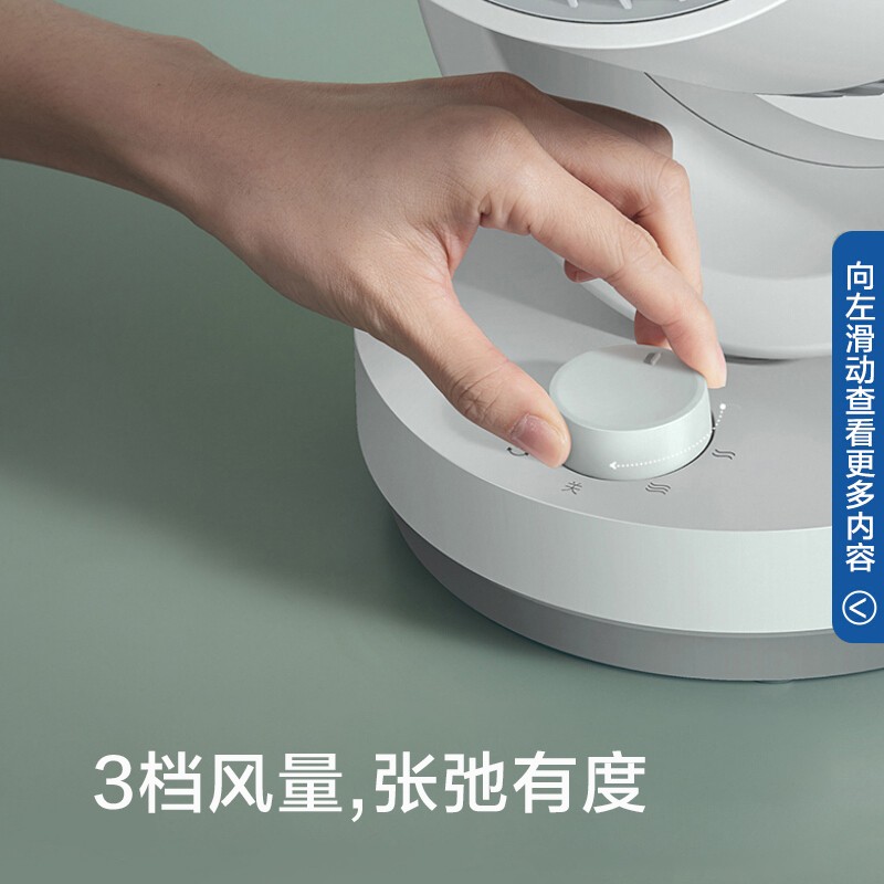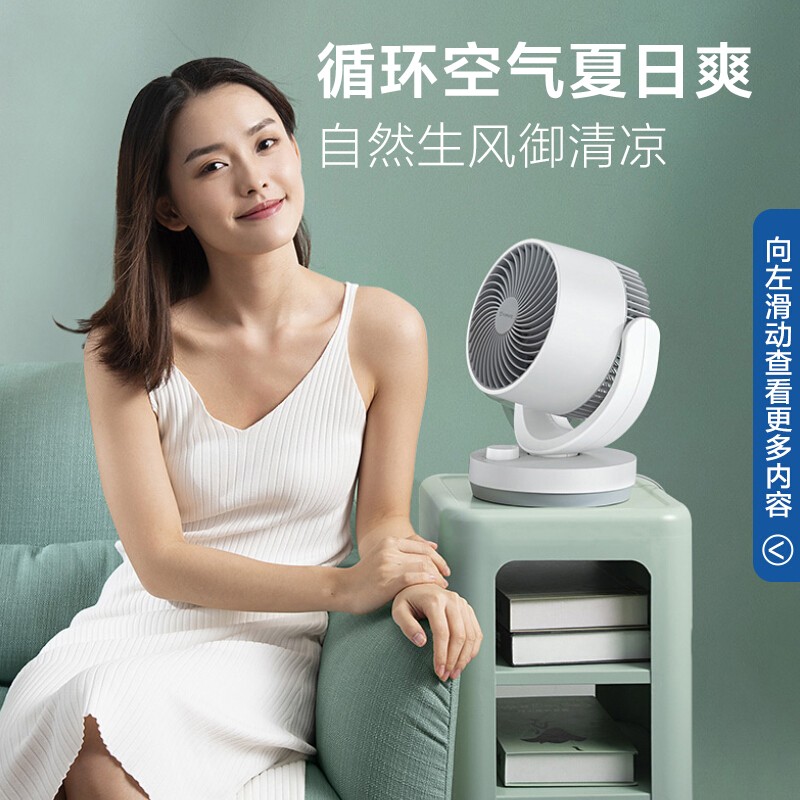 这款小风扇采用新型螺旋推进系统,大倾角螺旋扇叶,多角度3D立体送风,左右120度自动摇头,上下75度可固定角度,3档位调节风量,静音工作,旋钮式操控方式。占地面积仅A4纸大小。额定功率35w,产品尺寸20.5mm*24.5mm*29.5mm。