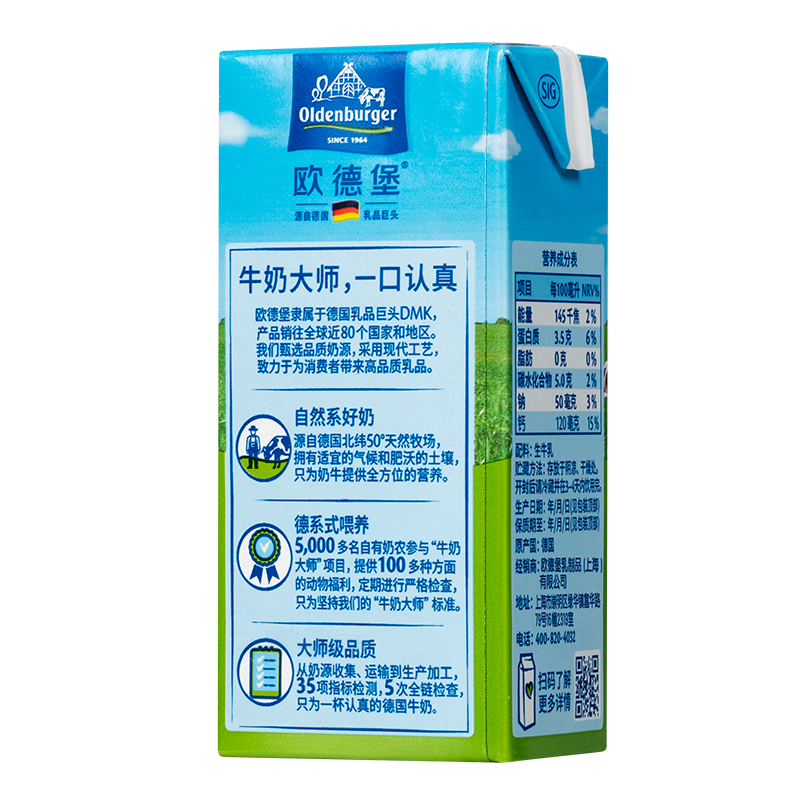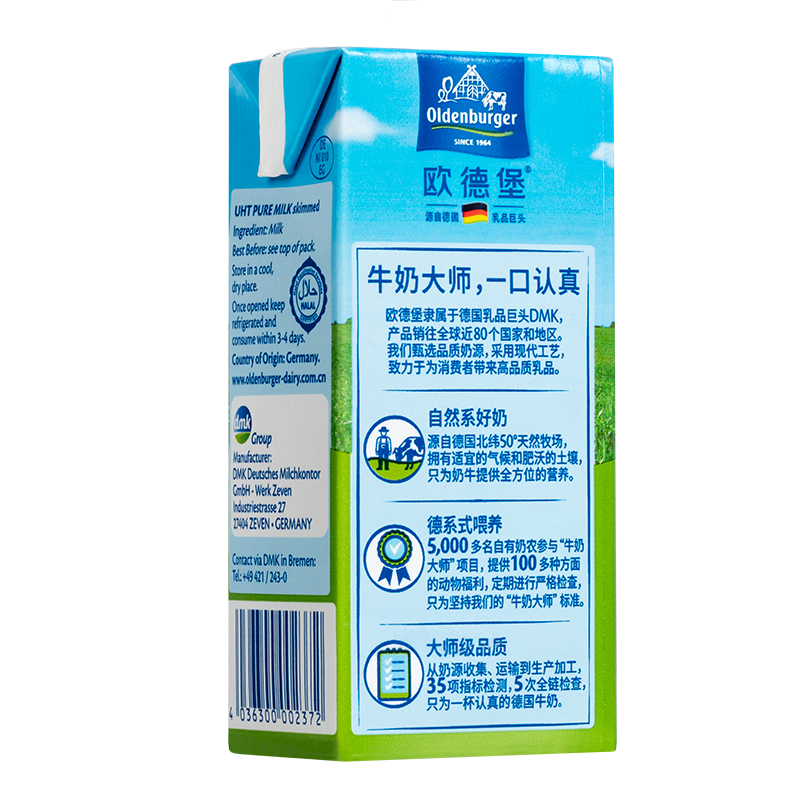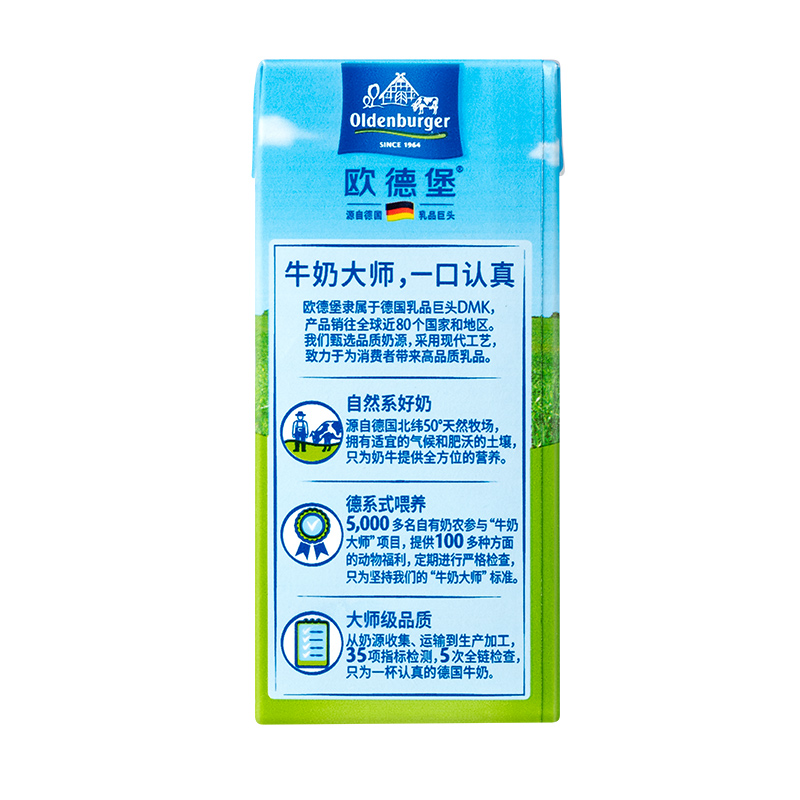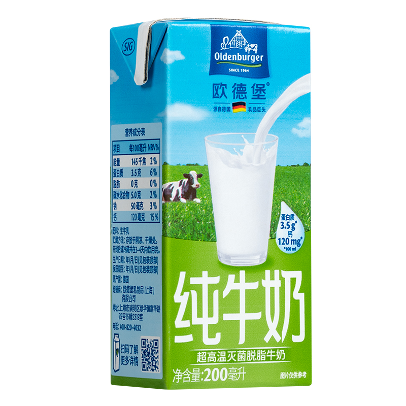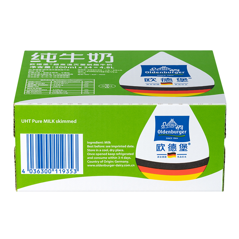 这款欧德堡超高温处理部分脱脂牛奶,采用天然奶源经UltraHighTemperature超高温杀菌处理,具有保存期长的特点。半脱脂奶的脂肪含量大约是1.5%。规格1L/包。