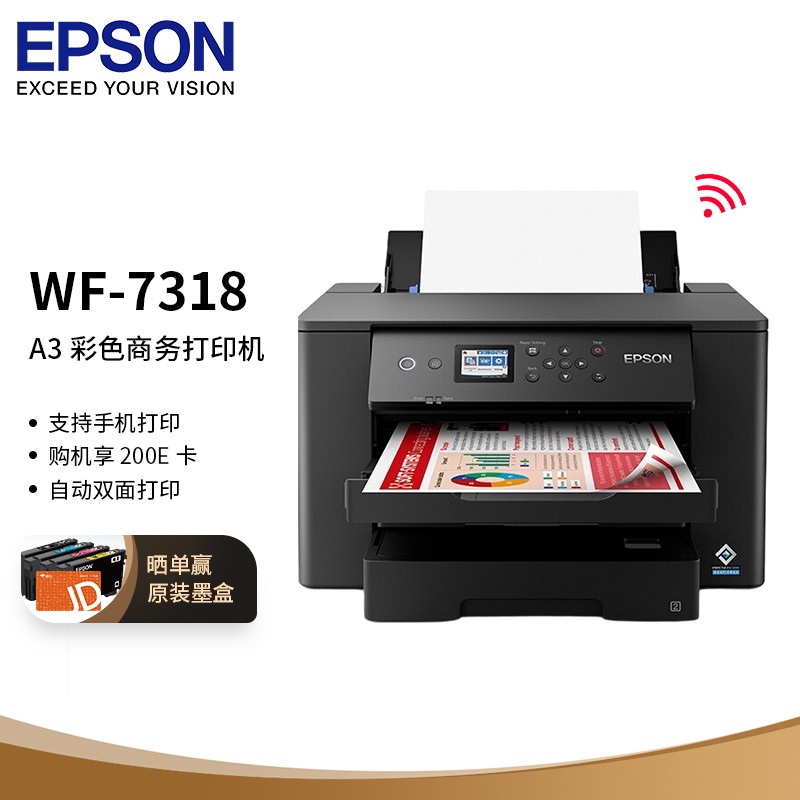 此款爱普生 WF-7318 为型号WF-7218的升级款,A3+幅面4合1多功能一体机采用紧凑设计,比前代机型体积缩小24%;适应快节奏商务办公打印需求,黑白25页/分钟,彩色12页/分钟,高效稳定输出,使其成为商务办公的可靠伙伴。搭配独立4色颜料墨水,防水耐光,速干、耐刮蹭、抗氧化。信息传递清晰,防篡改并可长久保存。标配有线/无线/无线直连,支持移动/远程打印,支持微信小程序打印*1,适用于多种办公环境,让打印随时可行。