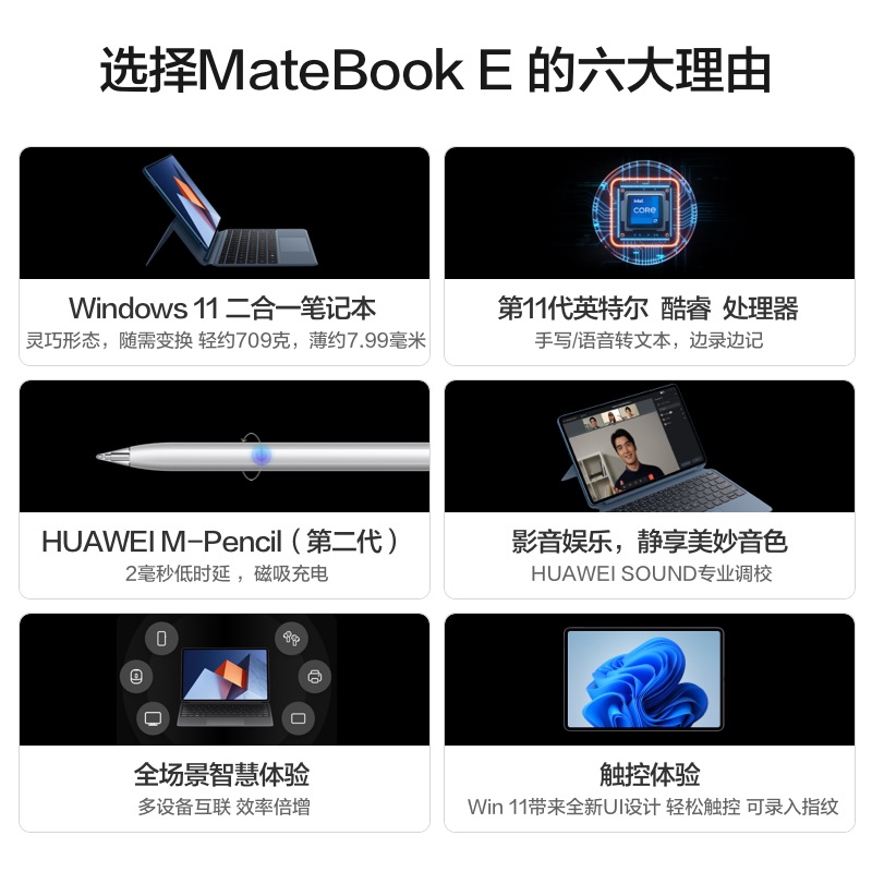 配置方面,华为MateBook E搭载了第十一代英特尔酷睿处理器,采用10nm制程工艺,并配备锐炬Xe核显,内置独立风扇和VC液冷散热系统。MateBook E内置Windows 11操作系统,支持多指触控手势,并支持连接第二代M-Pencil,键盘的触控板区域支持NFC触碰激活多屏协同。