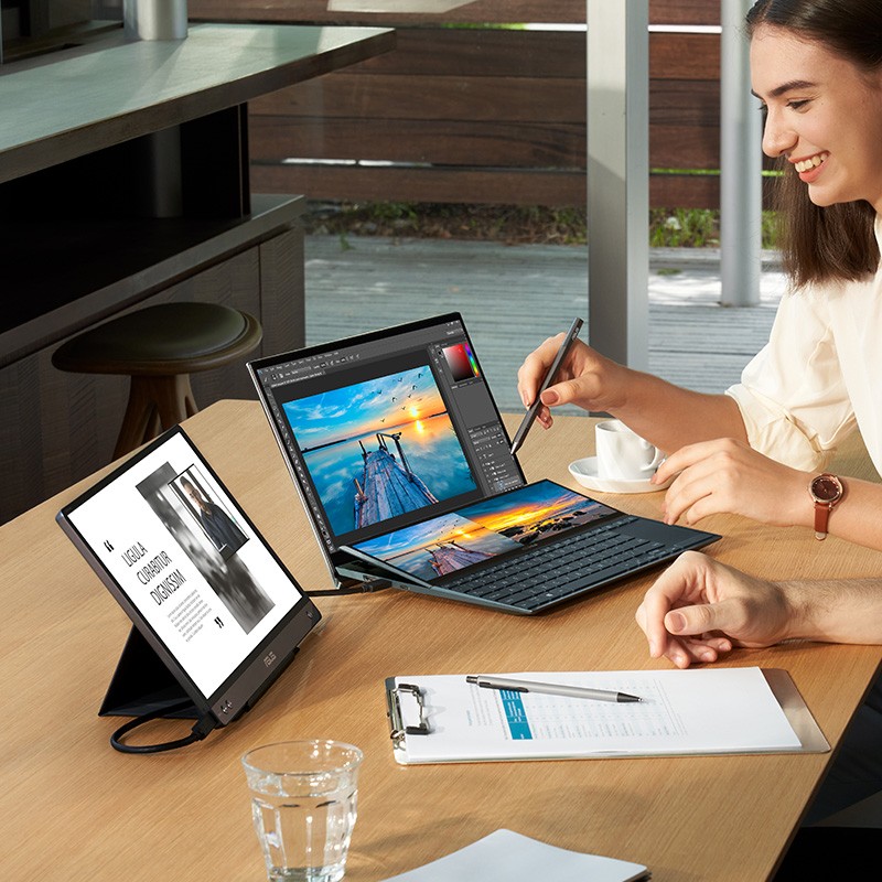 华硕此款灵耀X双屏笔记本电脑,采用双屏双触控的屏幕方案,主屏采用14英寸NanoEdge微边框屏幕,屏占比高达93%,拥有100%srGB色域,1080P分辨率,并通过潘通色彩认证,400nit亮度,TUV低蓝光不闪屏。副屏采用12.6英寸ScreenPad Plus全高清触控,同样拥有400nit亮度,支持强大的控制面板拓展功能,内置新一代的ScreenXpert软件,能够充分提升工作效率。同时,灵耀X双屏笔记本电脑还支持4096级压感手写笔,支持10点触控。