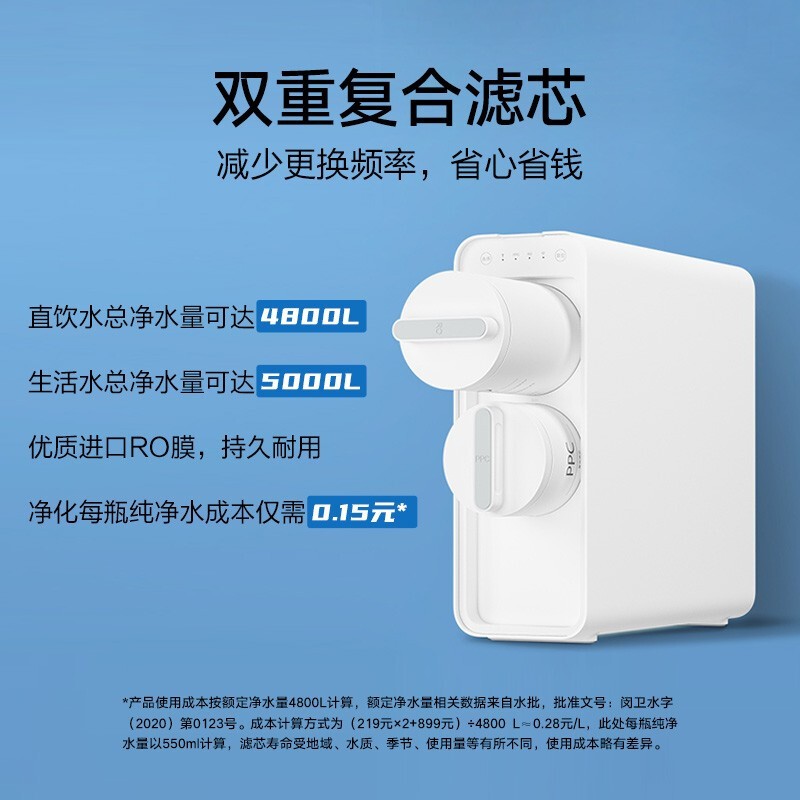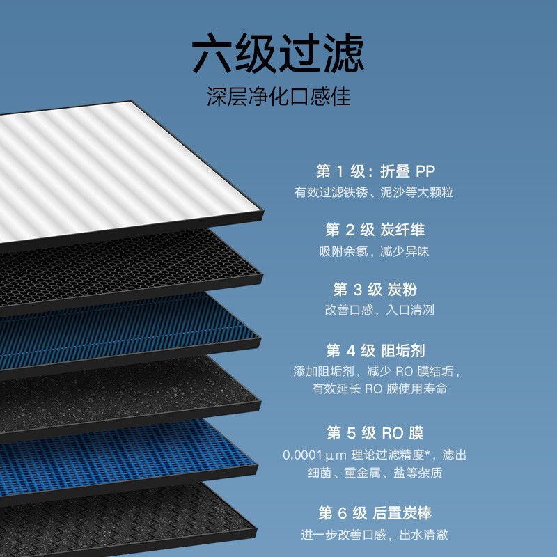 这款净水器采用800G大通量RO膜,接满一杯水仅需5秒,接满1L热水壶也仅需半分钟,用水不再久等。RO反渗透六级过滤,使用直饮水功能可以有效过滤自来水中的铁锈、细菌、铅、镉、汞、铬、砷等杂质,还能吸附水中余氯及异味,新鲜直饮无需久等。配备双出水龙头,左侧生活水经复合滤芯过滤,有效过滤水中泥沙、铁锈和吸附余氯等杂质,清洗蔬果、洗碗刷锅安全放心,同时无需消耗RO反渗透滤芯寿命,降低使用成本。采用新型复合滤芯,在两根滤芯中融合了六级过滤,不仅水质纯净可直饮,更能改善饮用水口感,让直饮水清爽可口。