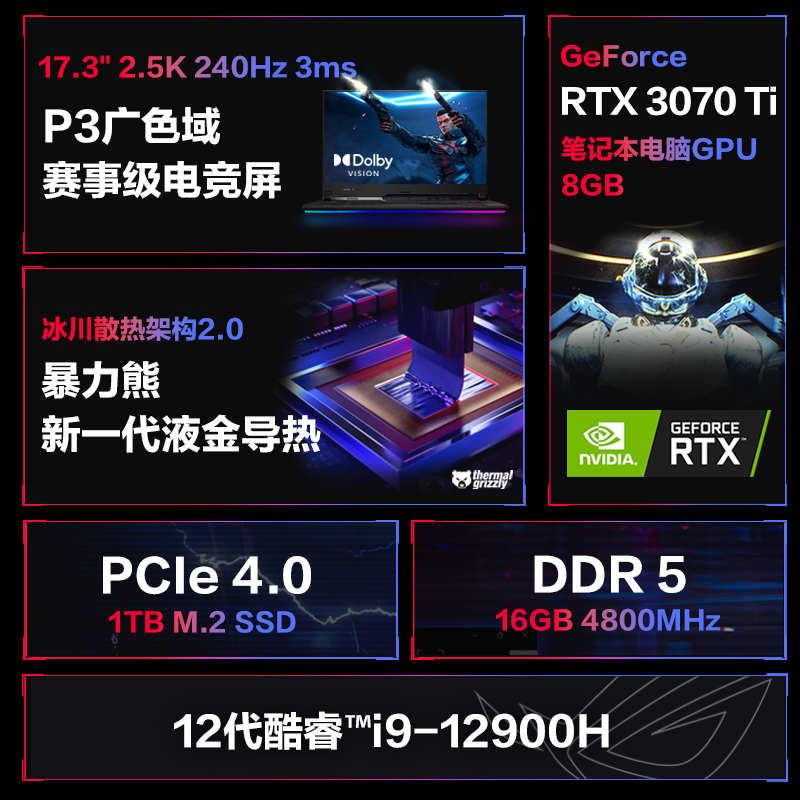 配置方面,枪神6 Plus搭载了i9-12900H处理器,10nm制程,14核心20线程,可达5.0GHz加速频率,借助ROG性能优化技术,持续功率高达90W;显卡采用全新架构RTX 3070i 独立显卡;内存采用16GB DDR5 4800MHz双通道内存,至高支持扩展至64GB;硬盘采用1TB NVMe PCIe 4.0X4 SSD,读取速度7000MB/s,写入速度5000MB/s,预留M.2接口。