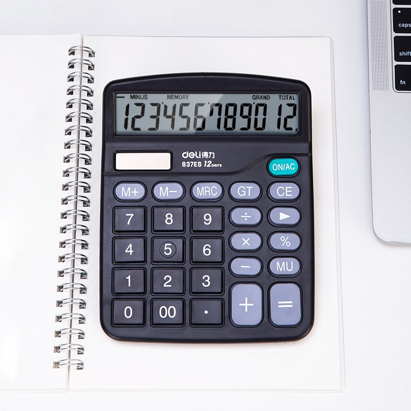 deli 得力 837ES 12位计算器,不带语音,配送电池,光电双驱动,带有大屏幕,尺寸120*150mm,双电源供电计算器,桌面型计算机百分比计算、塑胶按键、辅助计算功能、自动关机。适合平时经常计算的聚友。