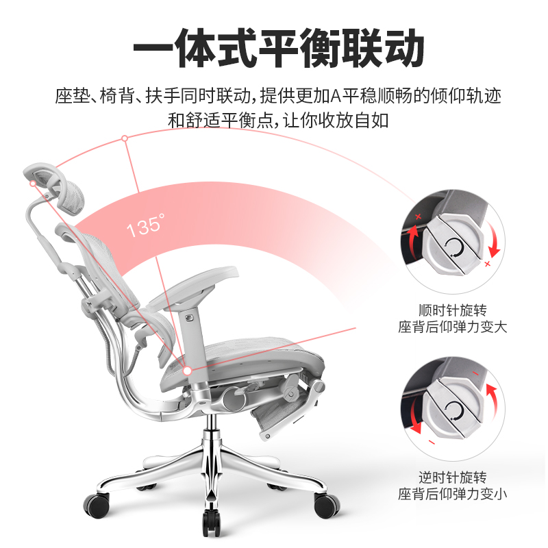 这款人体工学椅兼具了性能与颜值的双重优势,座椅椅背为分区支撑+腰背分离设计,针对肩部、背部、腰部给予不同的支撑,搭配4D智能释压腰枕,无需手动调整即可打造“撑腰”效果。32cm大曲面头枕+4D灵动扶手+135度最大后仰角度,坐垫、椅背、扶手实现一键联动,单杆可精准调控五大功能,操作简单、品质有保障。