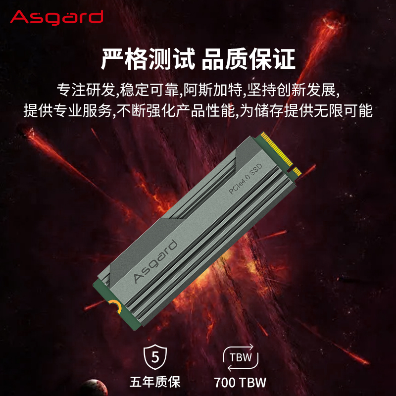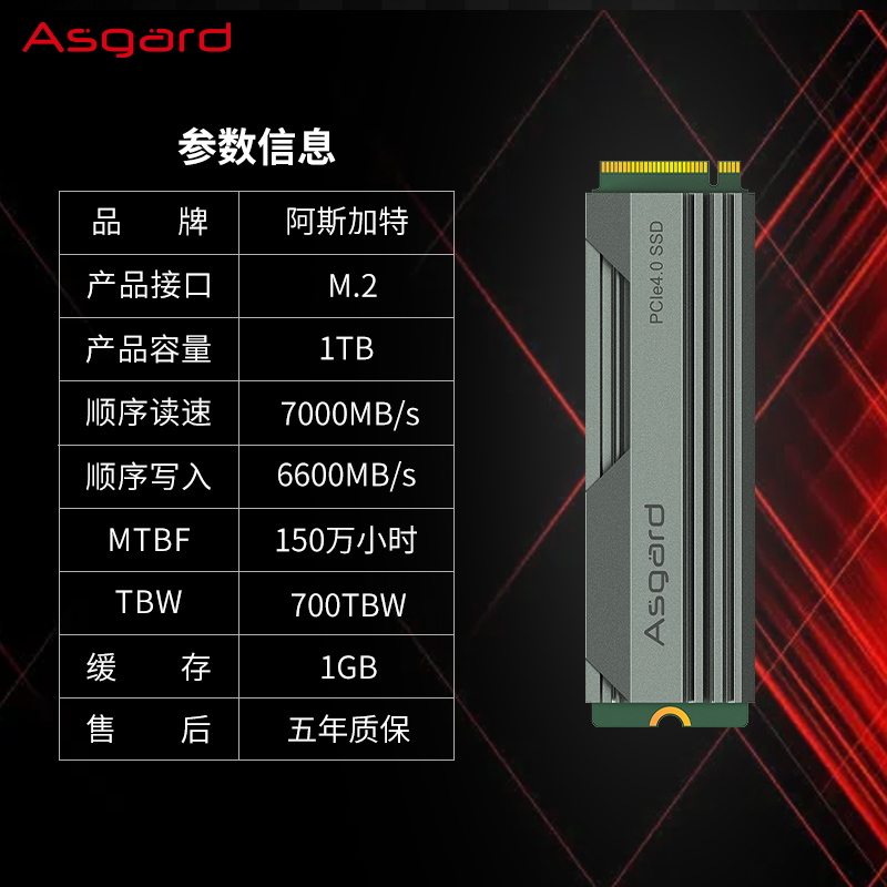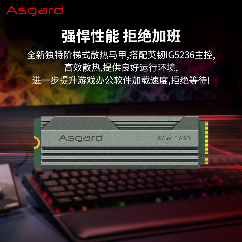 阿斯加特这款固态硬盘,M.2接口,支持NVMe1.4协议,搭载英韧5236主控,长江存储128层 TLC 3D NAND存储颗粒(型号:X2-9060),带1GB缓存,1TB大容量,连续读取速度最高7500MB/s、连续读写速度最高5500MB/s。使用自主设计桶阶梯式散热通风管道,搭配精选矽硅脂,散热表现不错,700TB寿命,5年质保。