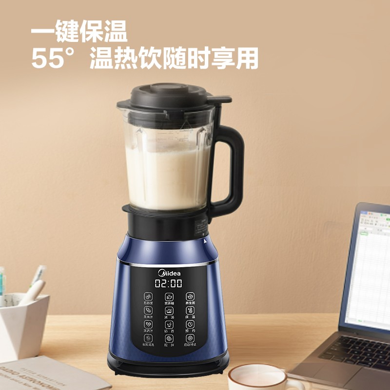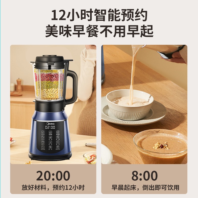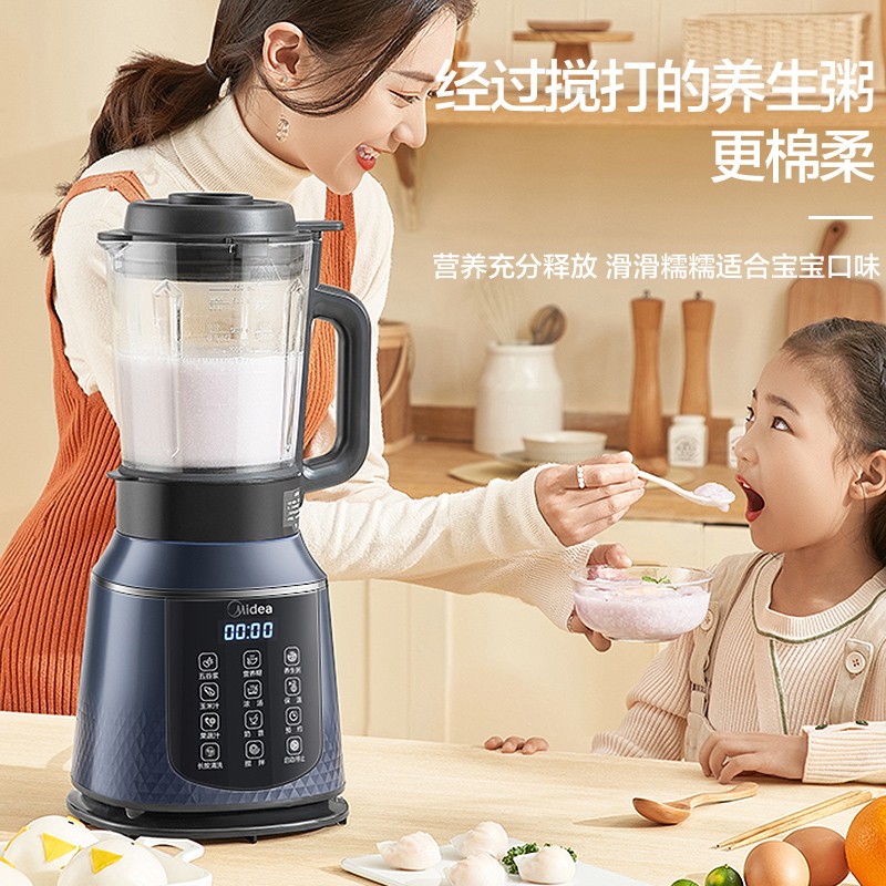 美的新款料理机,配备8叶精钢破壁刀,三层立体刀头,转速达到3万转/分钟。加热功率1200W,大火力加热,快速熟透不糊底,配备4筋扰流杯,磁控开盖保护更安全,支持提杯停机,配备过热保护。多种烹饪功能设定,支持12小时预约。