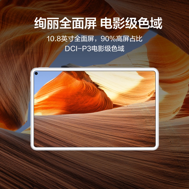 这款 MatePad Pro 在外观上,机身采用隐形天线设计,一体式机身,微弧面中框,拥有夜阑灰、青山黛、贝母白三种配色,配置 10.8 英寸全面屏,4.9mm 等距窄边框,拥有 90% 高屏占比,2560*1600 高清分辨率,280PPI 以及 DCI-P3 及色域,屏幕还采用“锐屏”显示增强技术,通过莱茵低蓝光认证。整体机身重约 460g。