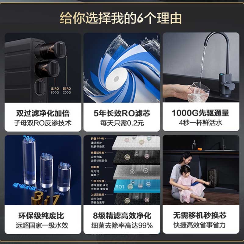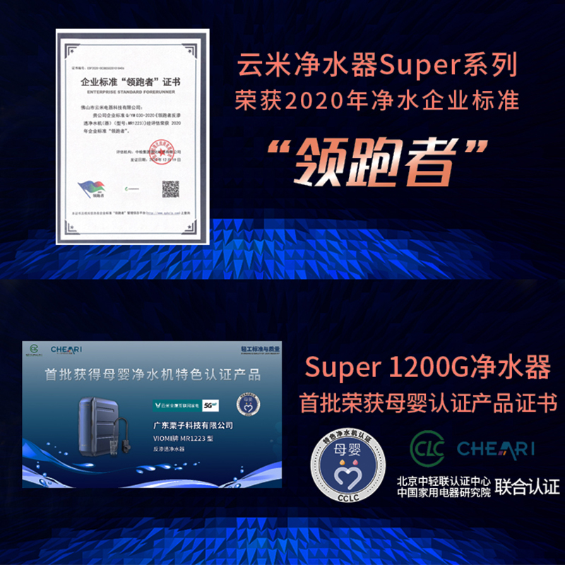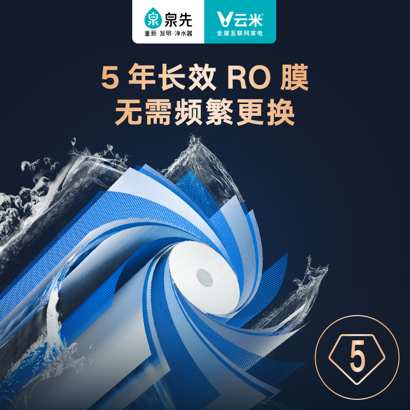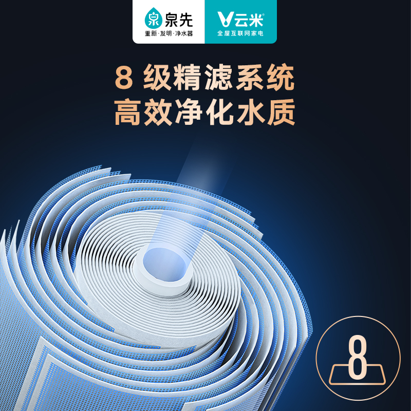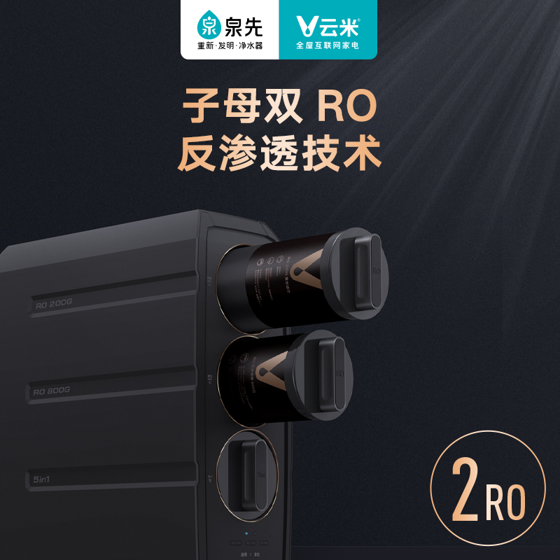 云米 泉先Super系列 反渗透纯水机拥有主800G、副400G两个RO滤芯,总制水速度高达1200G,3L/min的超高流速。经过主滤芯的废水再经副RO膜过滤一遍,进一步将净废比提高至3:1,进口RO膜,创新9页膜过滤,寿命长达8年。定制四腔泵双RO水泵,动力更足,噪音更小。OLED屏显水龙头,水质信息一目了然,手机APP智能检测提醒,滤芯寿命不足和工作异常可以轻松查看。