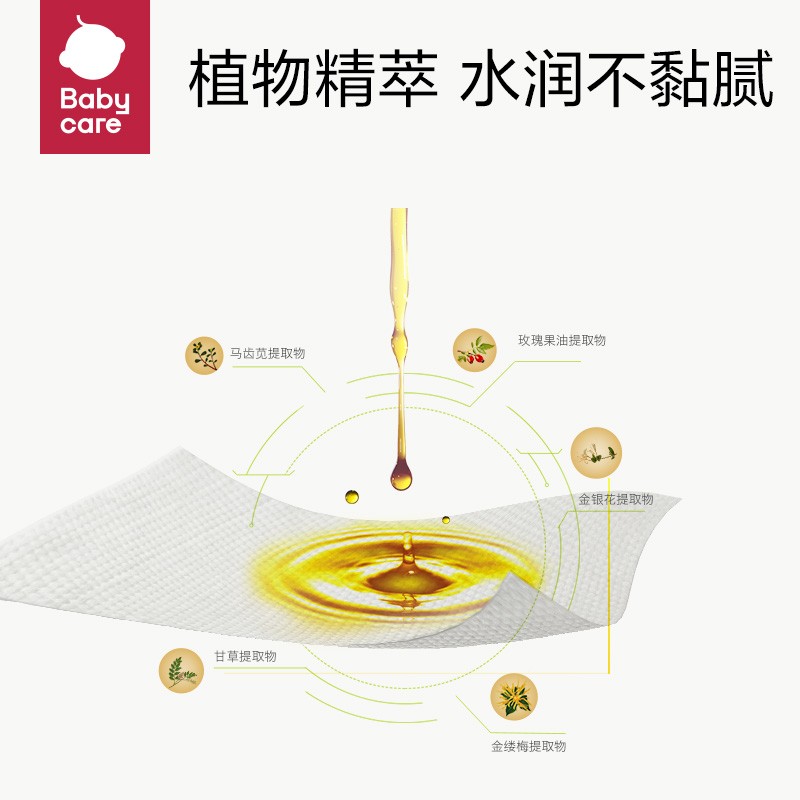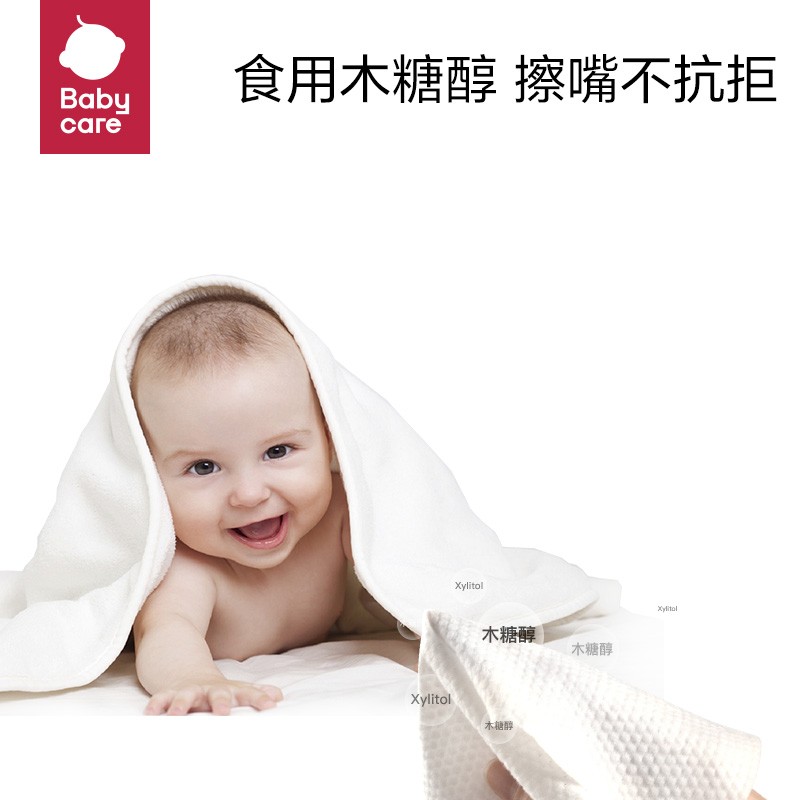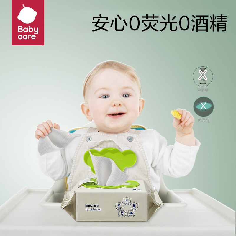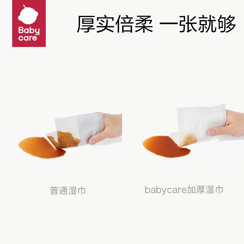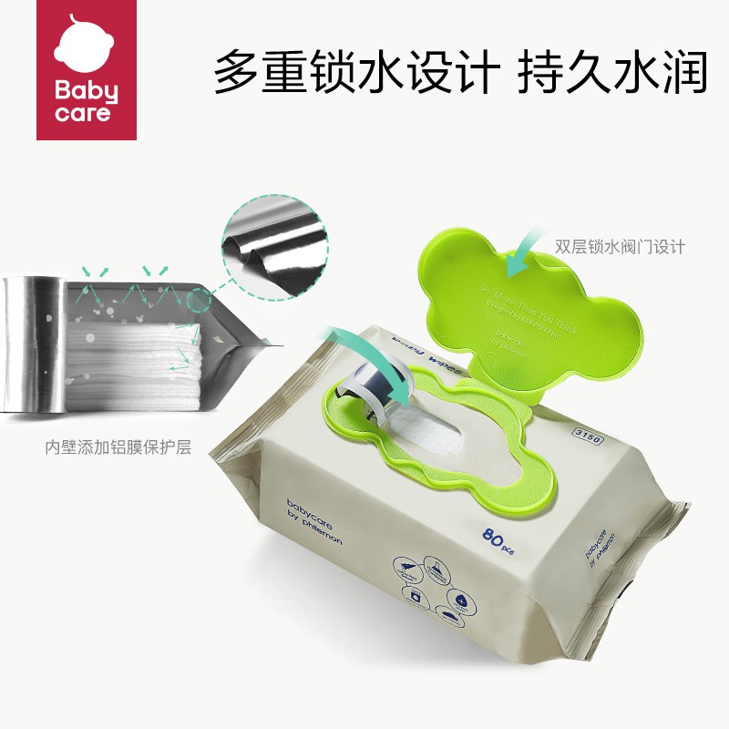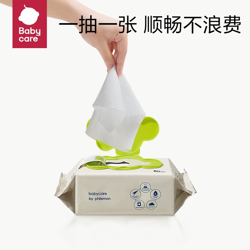 babycare 婴儿手口湿巾此款湿巾无添加,次净化纯水,加厚交叉全棉抗拉扯,不连抽,每包80抽。无化学成分添加,无酒精,无化学香料,7次精华EDI净水,含水量高。