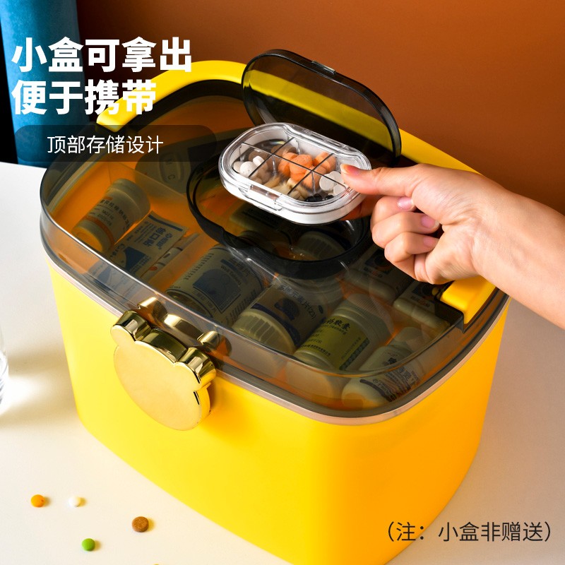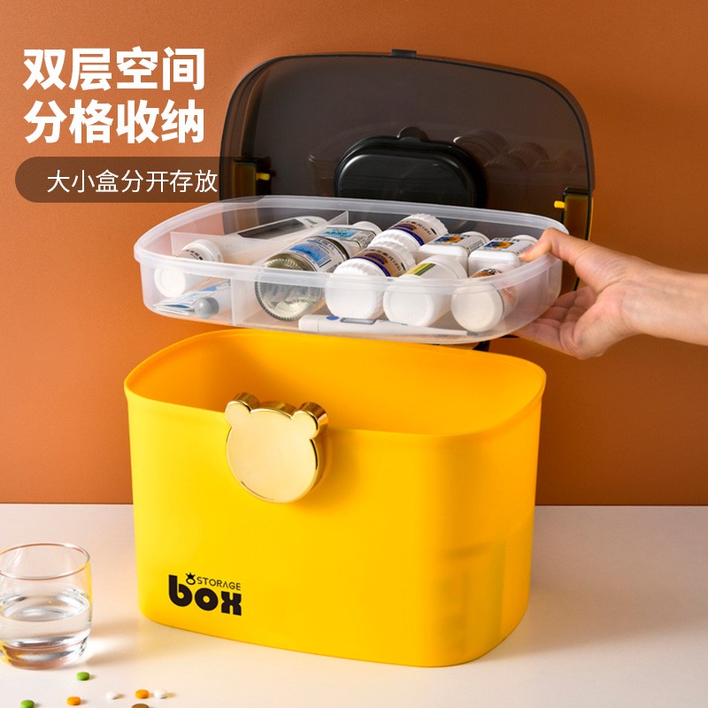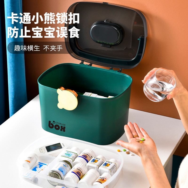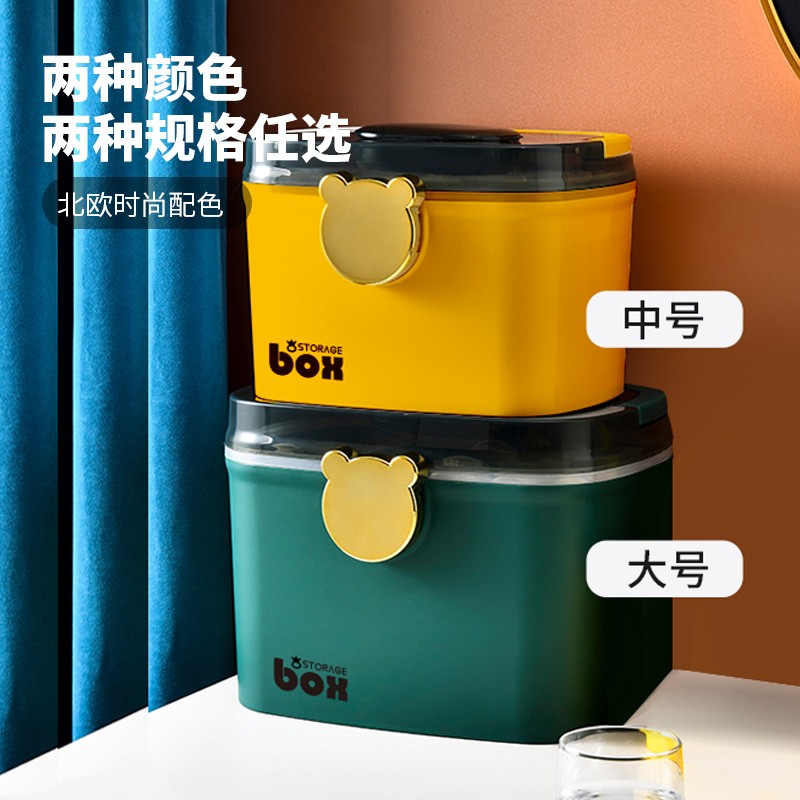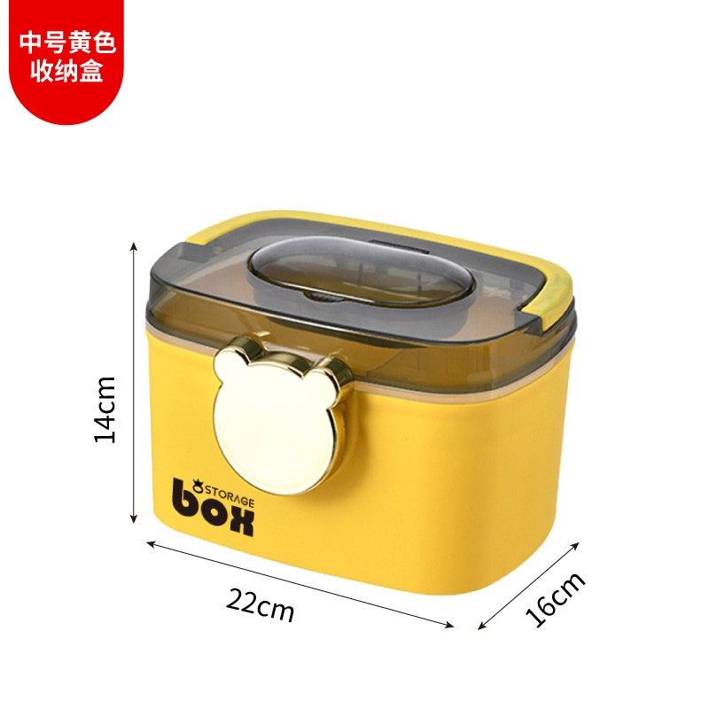 顶部独立盒,透明可视一目了然,双层空间分格收纳,卡通小熊锁扣,趣味横生,防夹手,宝宝不误食,悉心选好材料,储物无味无害,密封隔离防潮避光。