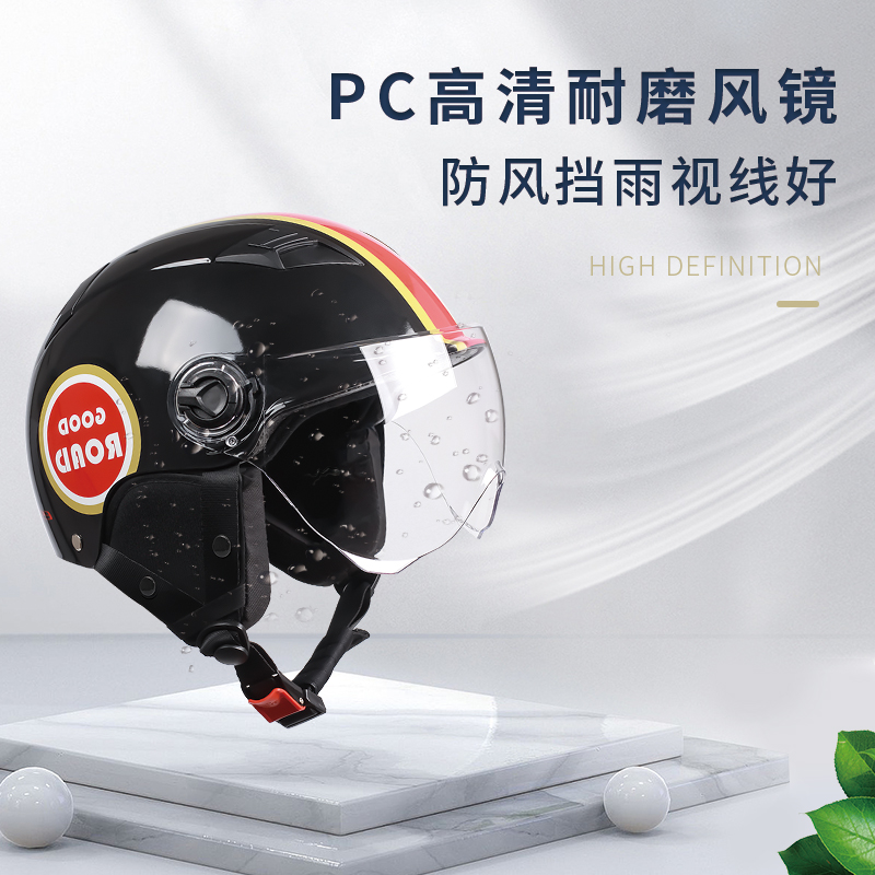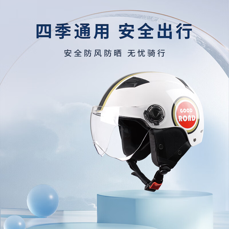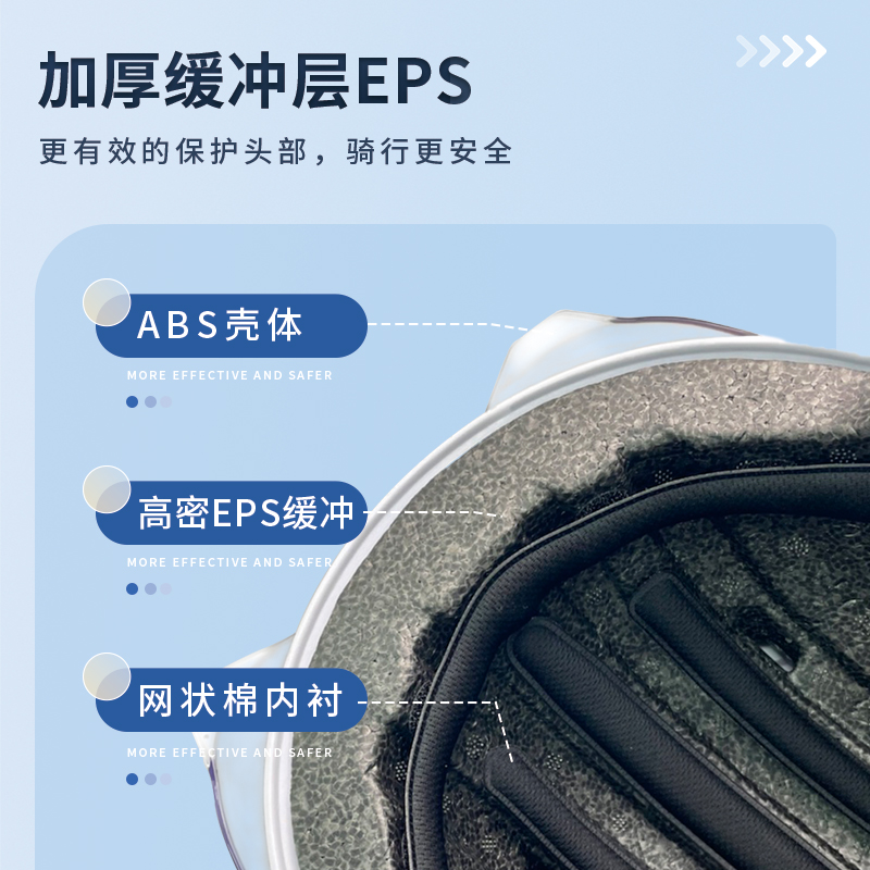 高强度ABS外壳,坚韧抗撞击、高强度、耐腐蚀、耐高温,层层防护看得见,有效保护头部安全。加厚进口EPS缓冲层,更有效的保护头部,骑行更安全。顶部设有可开闭透气孔,骑行途中空气可在盔内流动。PC高清耐磨风镜,防风挡雨视线好。