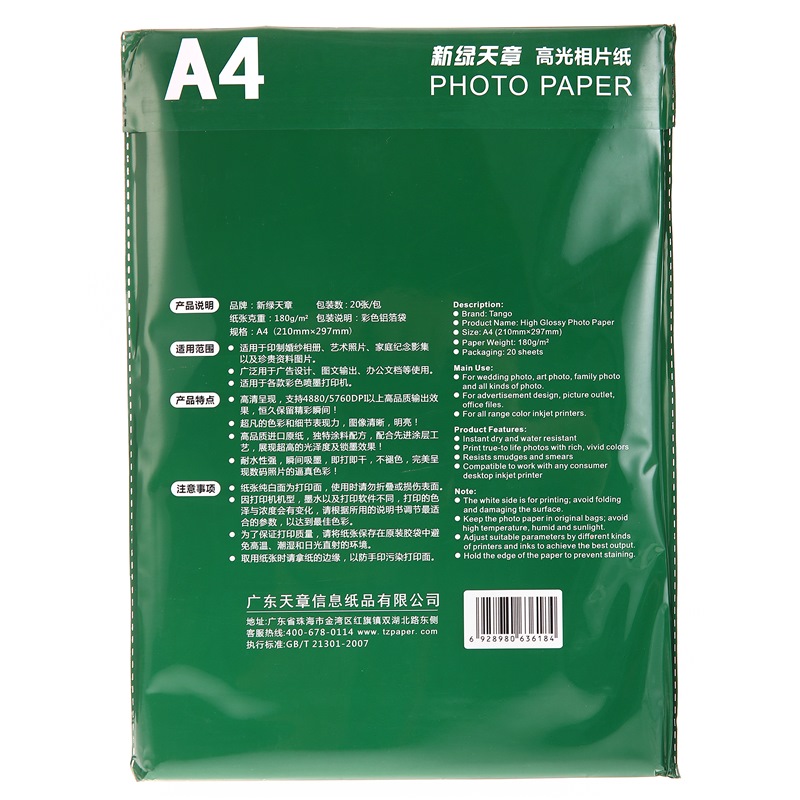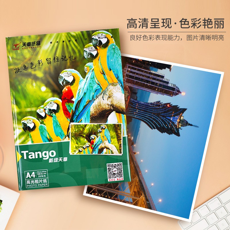 TANGO 天章 新绿天章 A4高光面相片纸 180g/㎡ 20张/包,四大优势留住美好瞬间。高清呈现保留精彩瞬间,支持4880/5760DP输出;良好色彩表现能力,图片清晰、明亮;耐水性强,瞬间吸墨,即打即干,不易褪色;独特涂层配方,配合良好,涂层工艺,照片光泽高;新绿天章相纸选用全木浆纸基,安全环保;可支持打印风景照、生活照、人物照、证件照,色彩分明,良好色彩感能力;即行即打,快速吸墨;耐光性强,可长期保存;吸墨力强,达到速干的效果;高挺度走纸流畅,畅享品质生活,适用于各种喷墨打印机。