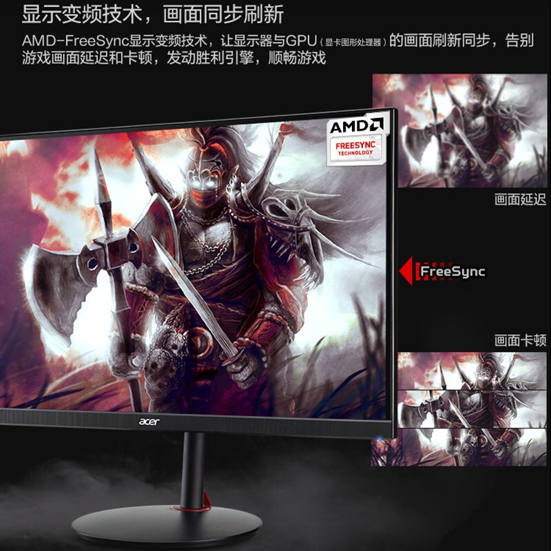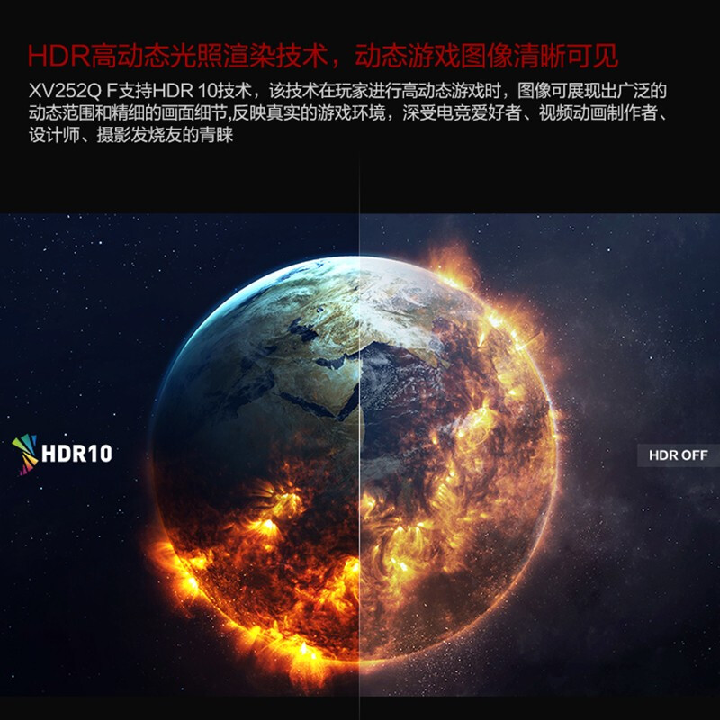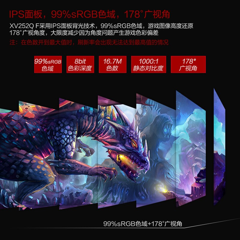 宏碁 XV252Q F边框较窄,基于24.5英寸Fast IPS面板(友达二代),1920x 080分辨率,支持390Hz超高刷新率,另外,还有1ms灰阶响应(还能超频低至0.5ms),支持AMD Fs防撕裂技术,并符合HDR400认证,峰值亮度400尼特。还有8 Bit色深,99% sRGB色域,1000:1静态对比度、100,000,000:1动态对比度,178度广角,内置双2W喇叭,支持不闪和滤蓝光以及丰富的扩展,包括双HDMI 2.0和DP 1.4(390Hz)以及音频输出。