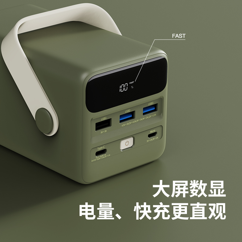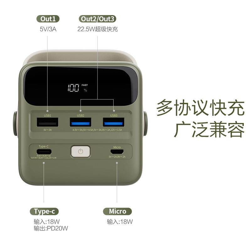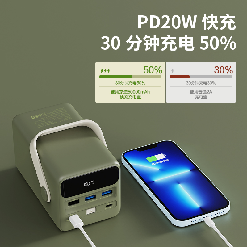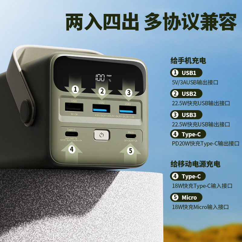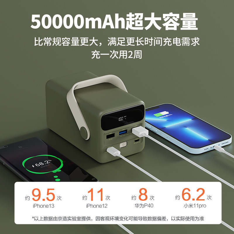这款移动电源,自带电量数显屏,具有50000mAh大电量,五输出双入设计,满足临时应急需求,支持安卓 Micro、Type-C、USB三种接口22.5W(Max)输入,最大可支持9V2A输入,便携手提,自带三档照明灯,PD双快充有效缩短蓄电等待时长,支持协议FCP/SCP、QC3.0、AFC、PD3.0,支持华为SCP22.5超级快充,支持苹果PD20W。