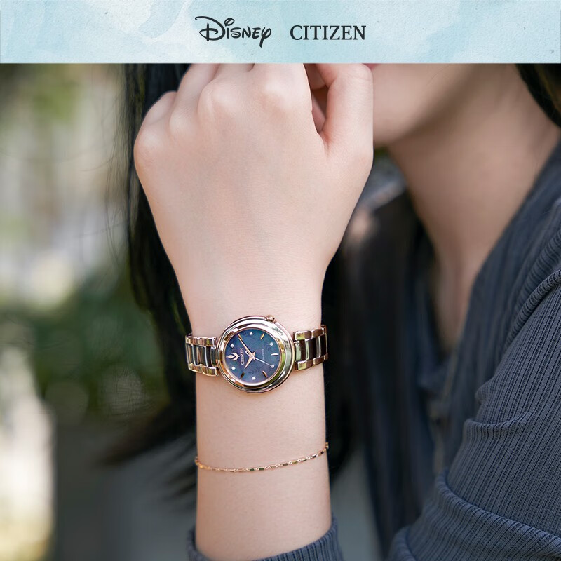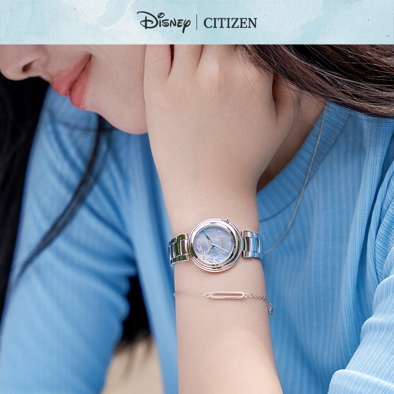 CITIZEN 西铁城 x 迪士尼 冰雪奇缘 艾莎款 女士光动能表 EM0580-58N,此款以艾莎为设计主题的表款,以冰蓝色表盘搭配银色不锈钢表壳表带,与人物的冰蓝色礼裙呼应,优雅、美丽、贵气不凡,充满强大的女王气势,表盘左上部装饰唯美冰魔法雪晶元素,象征自然本身蕴藏的无穷能量,分散装饰的银色饰钉犹,如伴随冰魔法飞舞的冰霜与冰晶,梦幻而灵动,背后还刻有“Fearless by nature”意为“勇敢、无所畏惧”,搭载光动能机芯,吸收可见光源转化成动能带动腕表运转,赋予其持久动力,人工合成蓝宝石玻璃,硬度大,强度高,坚固耐磨,不易磨损。表盘取材深海贝母,珠光微闪光彩动人,贝母柔情绽放瞬间,诠释女性特有动人魅力,每个角度在阳光下都能折射出梦幻光感,通透灵动的贝母光晕,层层叠叠,五光十色中蕴藏的时光画作,双按式蝴蝶扣,贴合手腕,佩戴方便;提供免费截取表带服务。