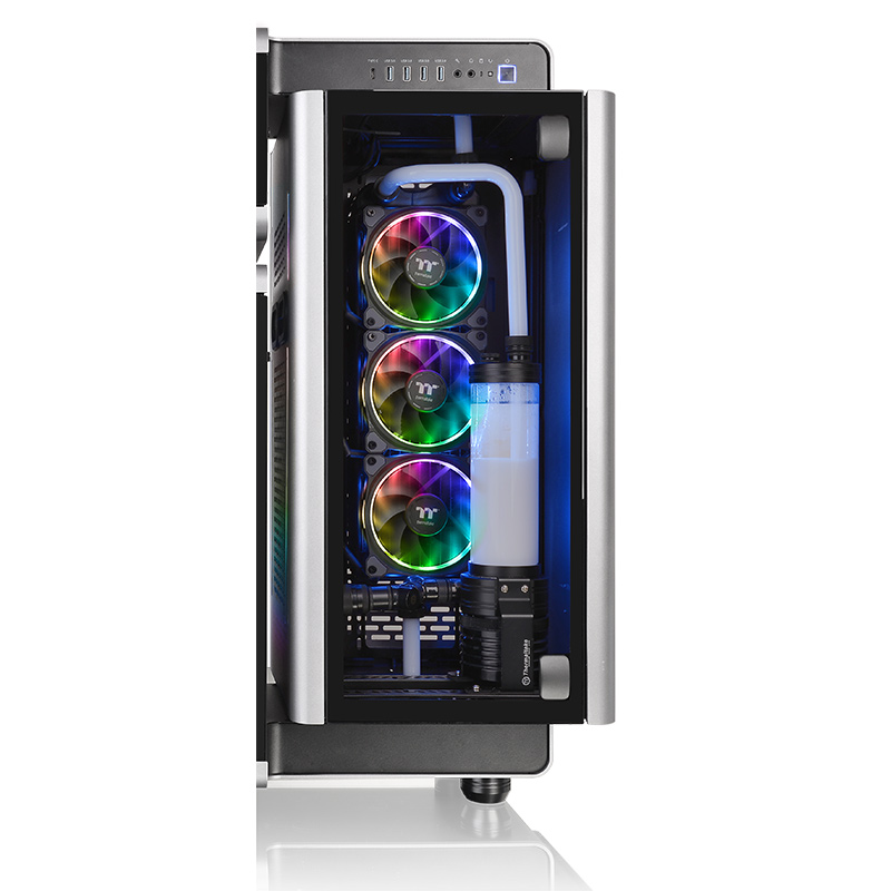 新一代Level 20依旧采用独特的分舱结构,拥有独立扩展空间,布局更加合理规整,并且通风散热更优秀。虽然依旧采用分舱结构,但与Level 10有了很大不同,所有舱位均完全透视化,而且对水冷扩展也进行优化,通过了Tt LCS Certified”水冷认证,拥有强大的扩展能力。Level 20采用全铝材质,CNC高精度切割喷射而成,侧面拥有4mm钢化玻璃,侧透挡板有铰链连接。顶部I/O扩展包括USB 3.1 TYPE-C。规格方面,可支持EATX平台,20cm高散热器,31cm长显卡,22cm长ATX电源(垂直/平卧),提供11个3.5英寸/2.5英寸储存扩展。对风冷和水冷的支持上,内可容纳360mm水冷排,还配备了三把Riing Plus 14 RGB风扇,还集成Riing Plus RGB控制盒和Lumi Plus LED灯条,支持1680万RGB幻彩灯效,均可通过Riing Plus RGB软件进行定制。